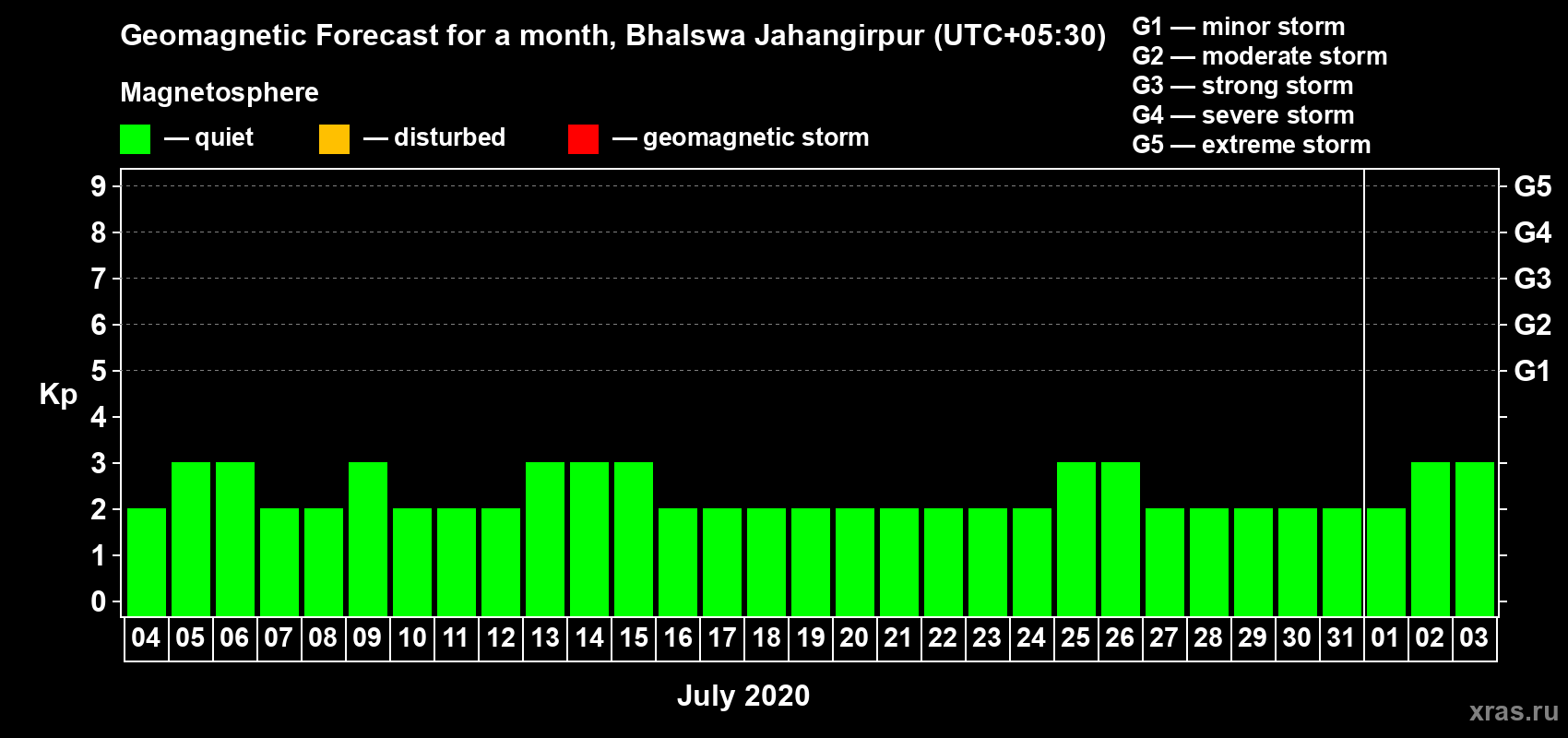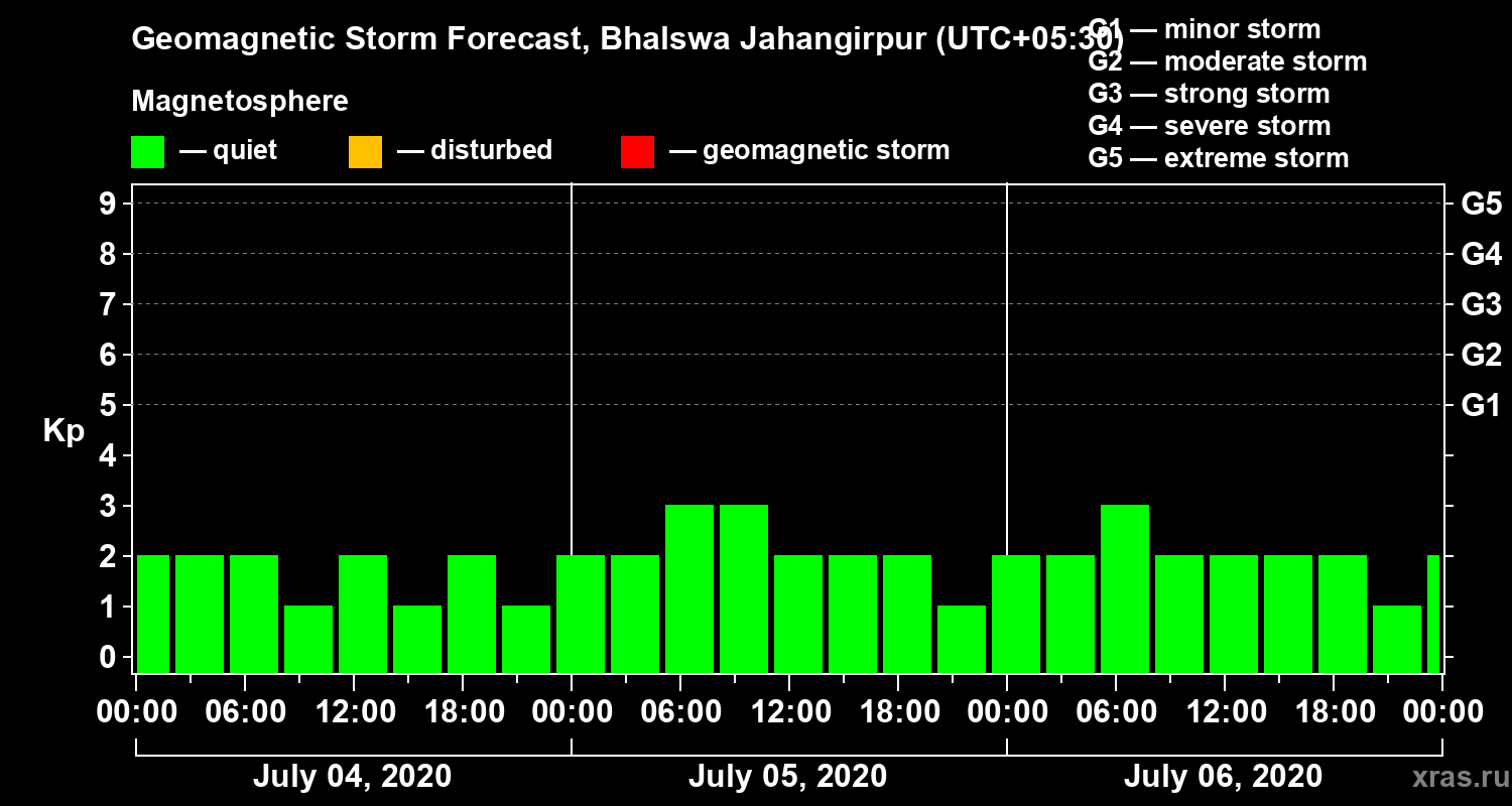 Geomagnetic storm forecast in Bhalswa Jahangirpur for Jul 04, 2020