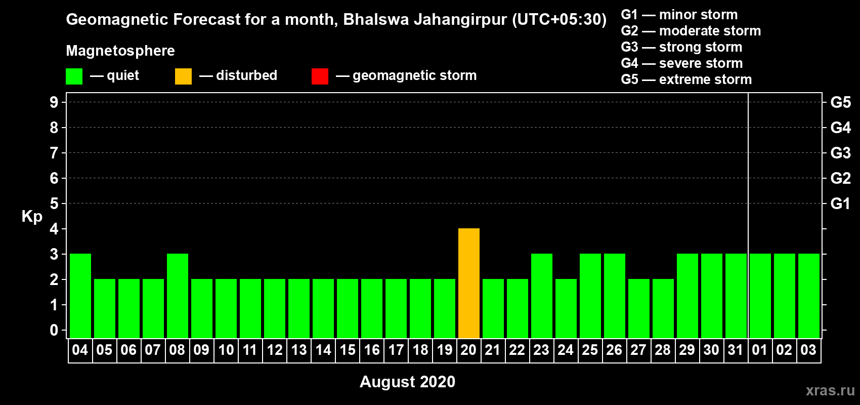 Geomagnetic storm forecast in Bhalswa Jahangirpur for Aug 04, 2020