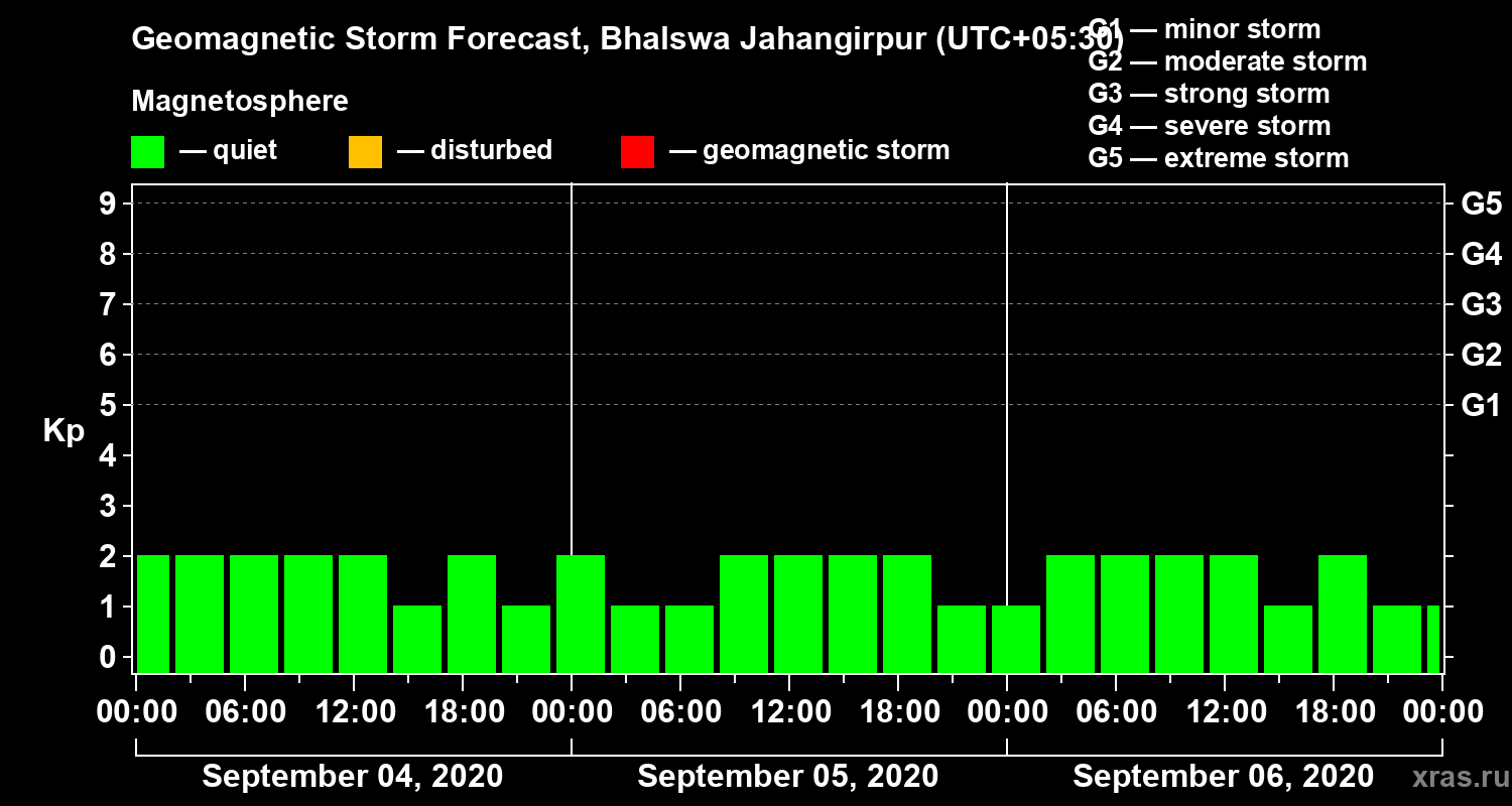 Geomagnetic storm forecast in Bhalswa Jahangirpur for Sep 04, 2020