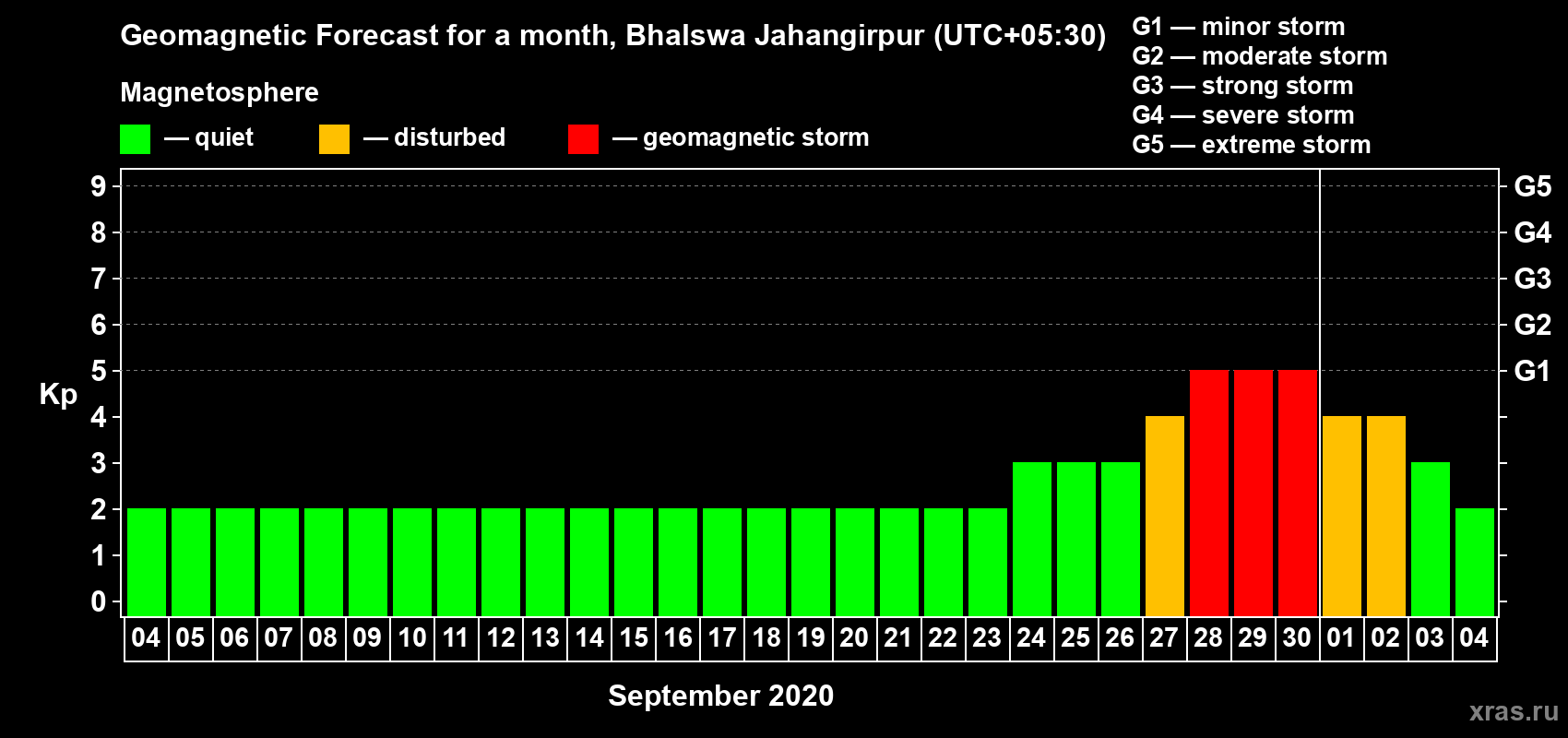 Geomagnetic activity forecast in Bhalswa Jahangirpur — Sep 04, 2020