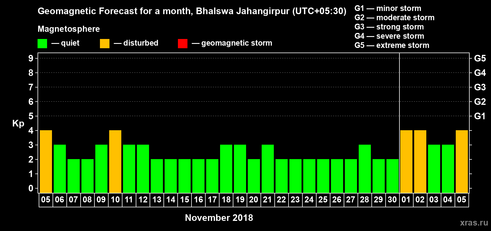 Geomagnetic storm forecast in Bhalswa Jahangirpur for Nov 05, 2018