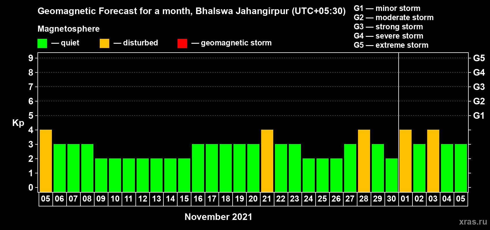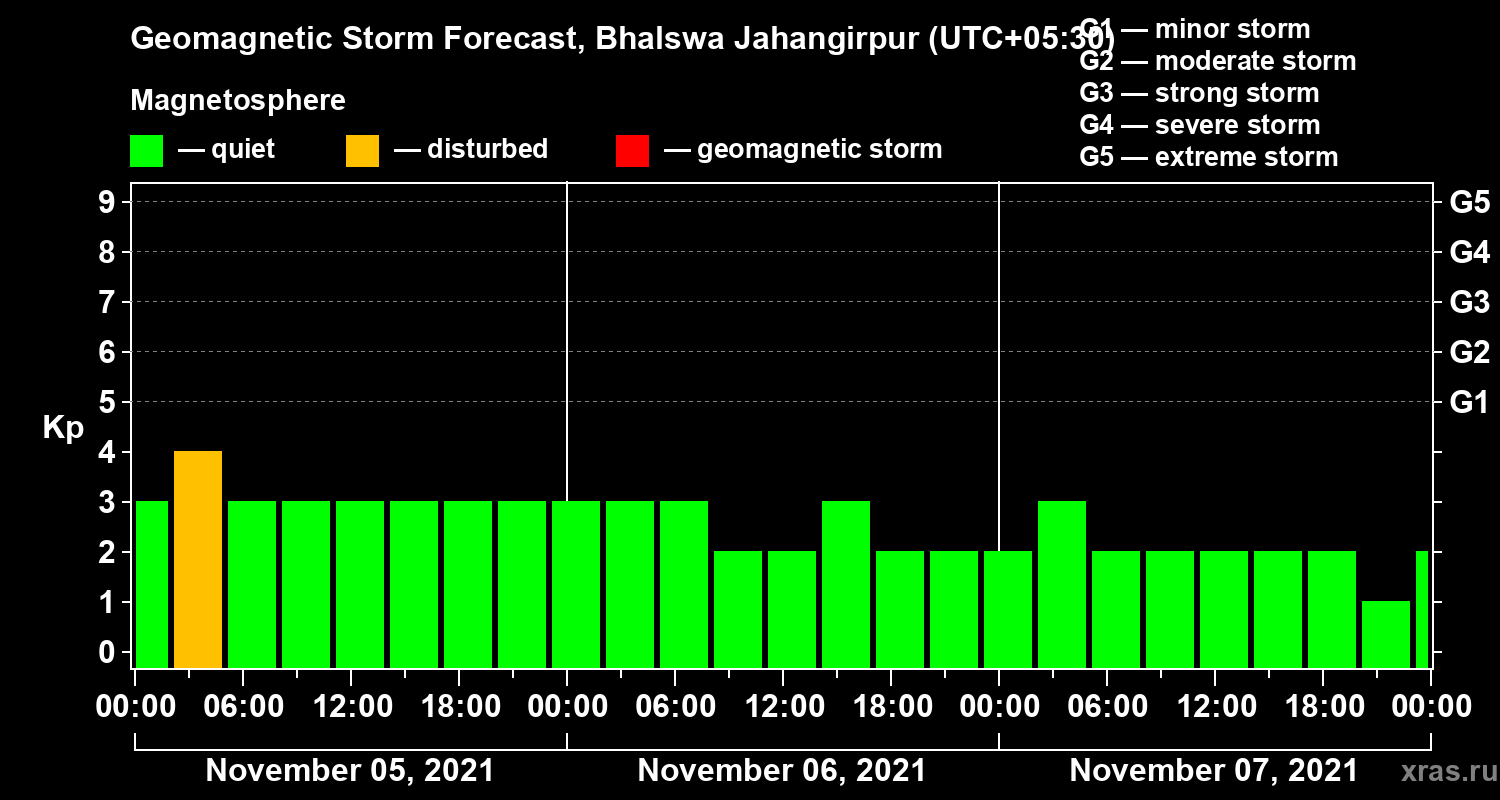 Geomagnetic storm forecast in Bhalswa Jahangirpur for Nov 05, 2021