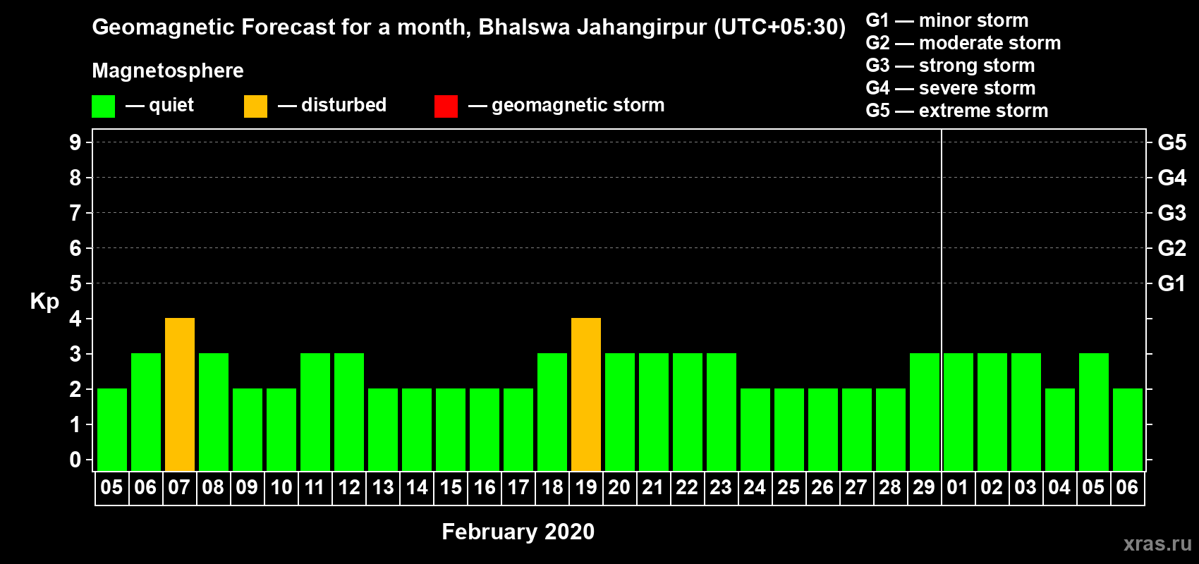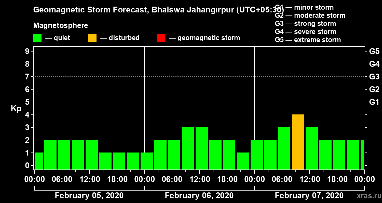 Geomagnetic storm forecast in Bhalswa Jahangirpur for Feb 05, 2020