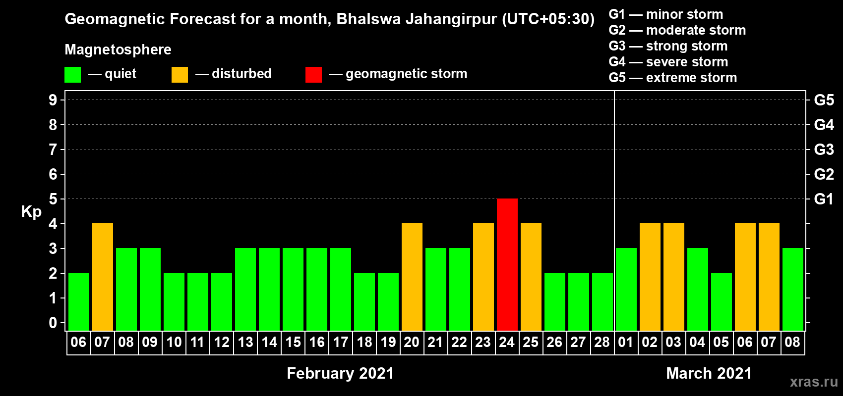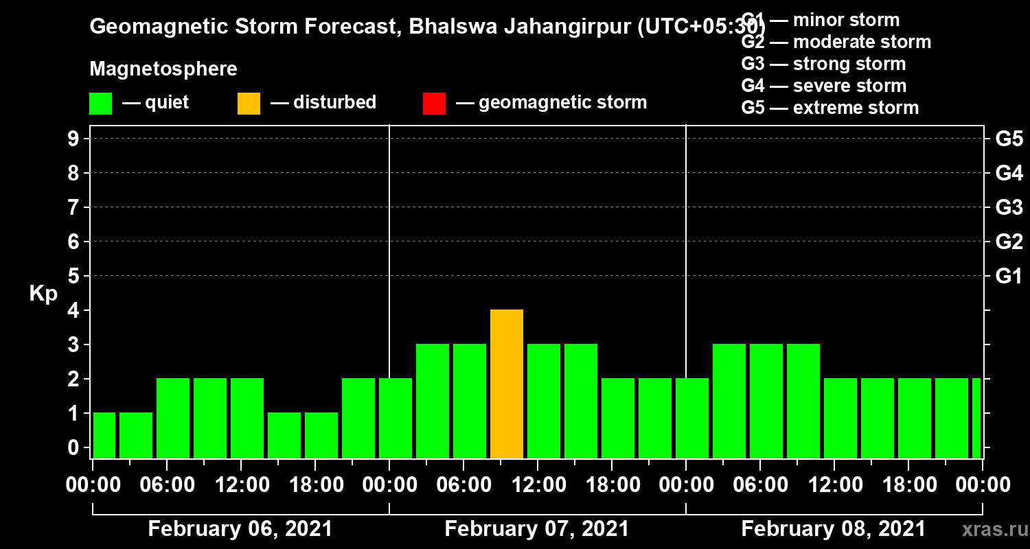 Geomagnetic storm forecast in Bhalswa Jahangirpur for Feb 06, 2021
