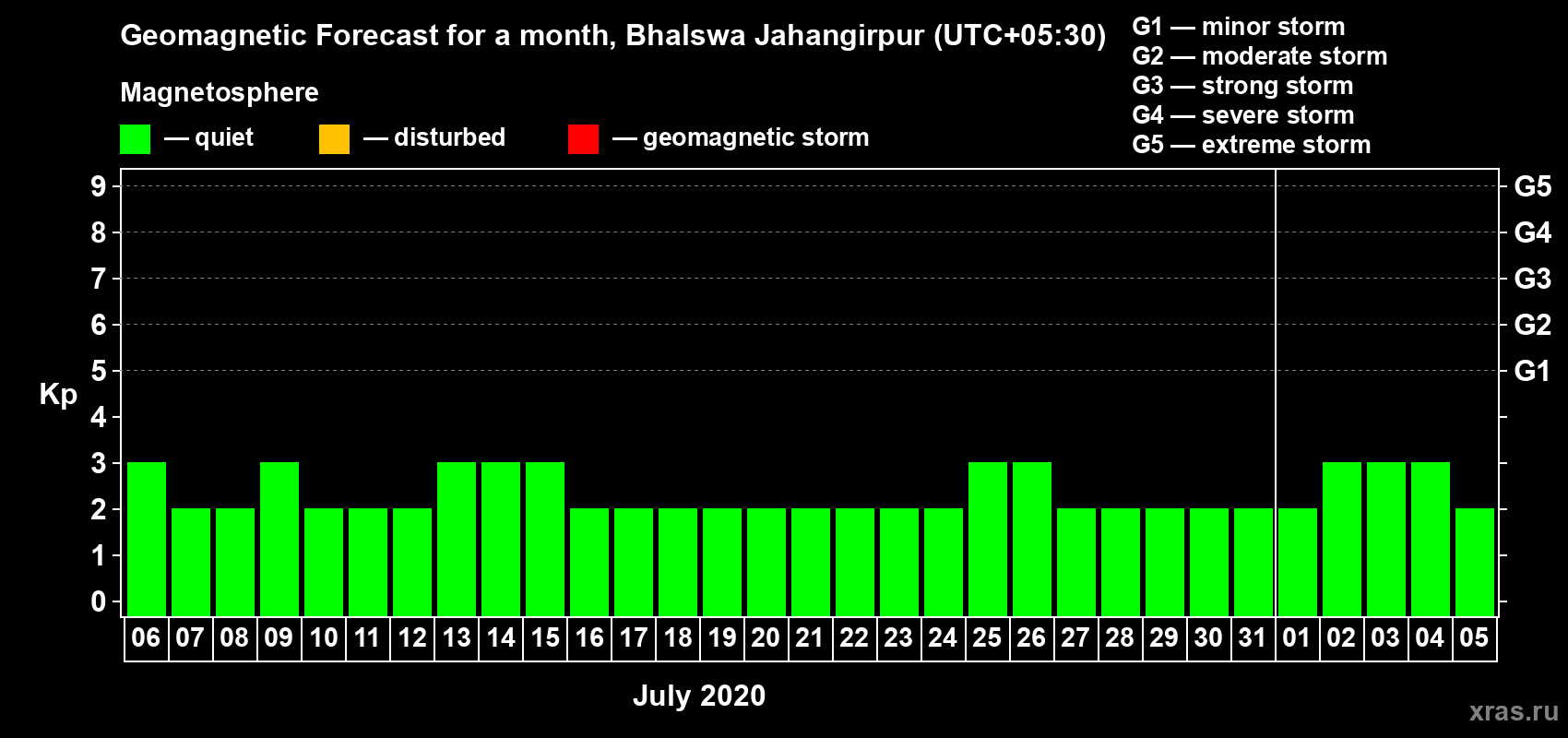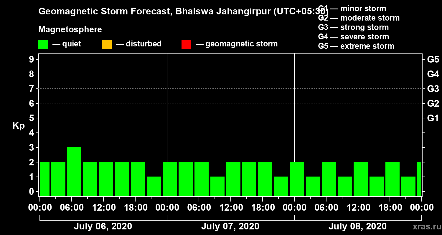 Geomagnetic storm forecast in Bhalswa Jahangirpur for Jul 06, 2020