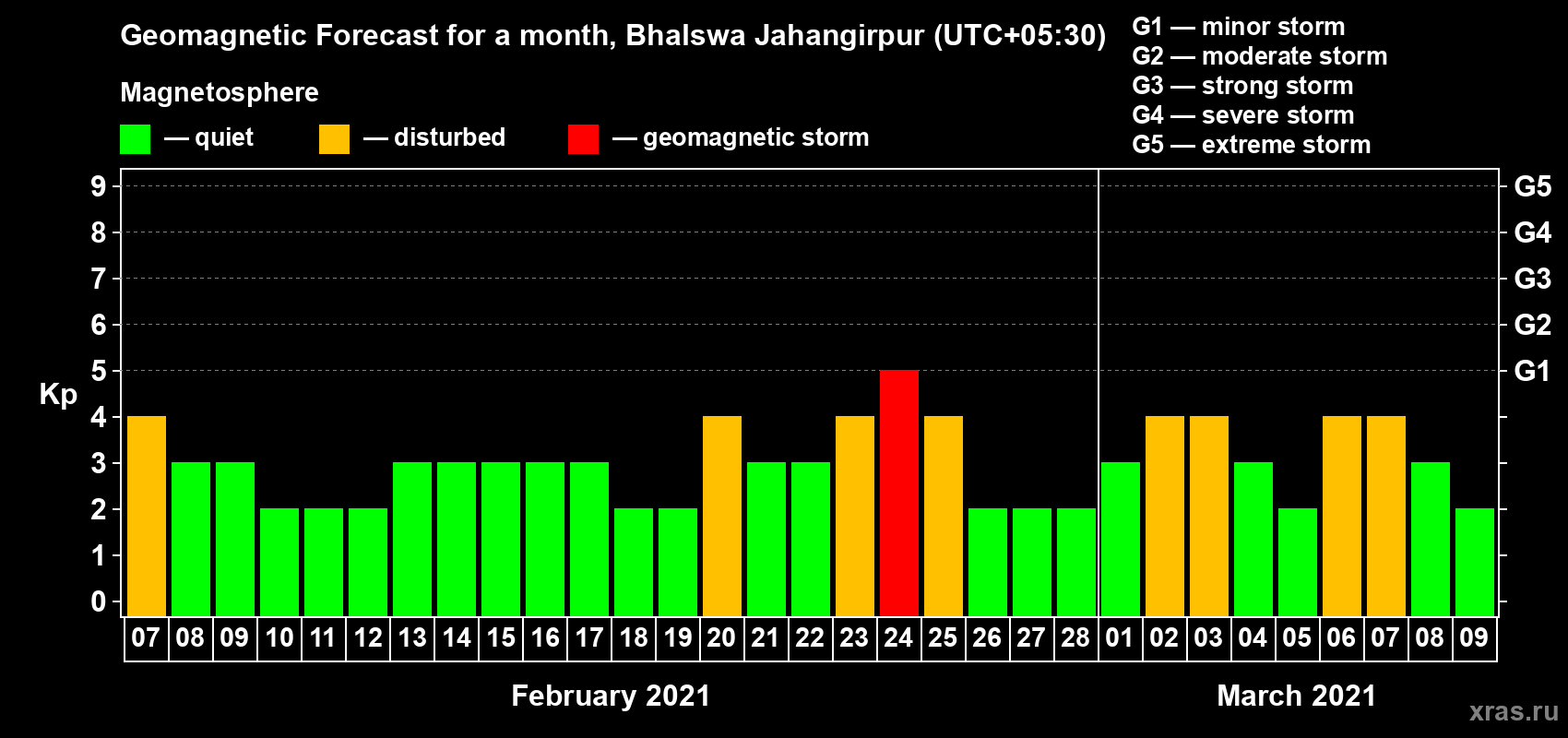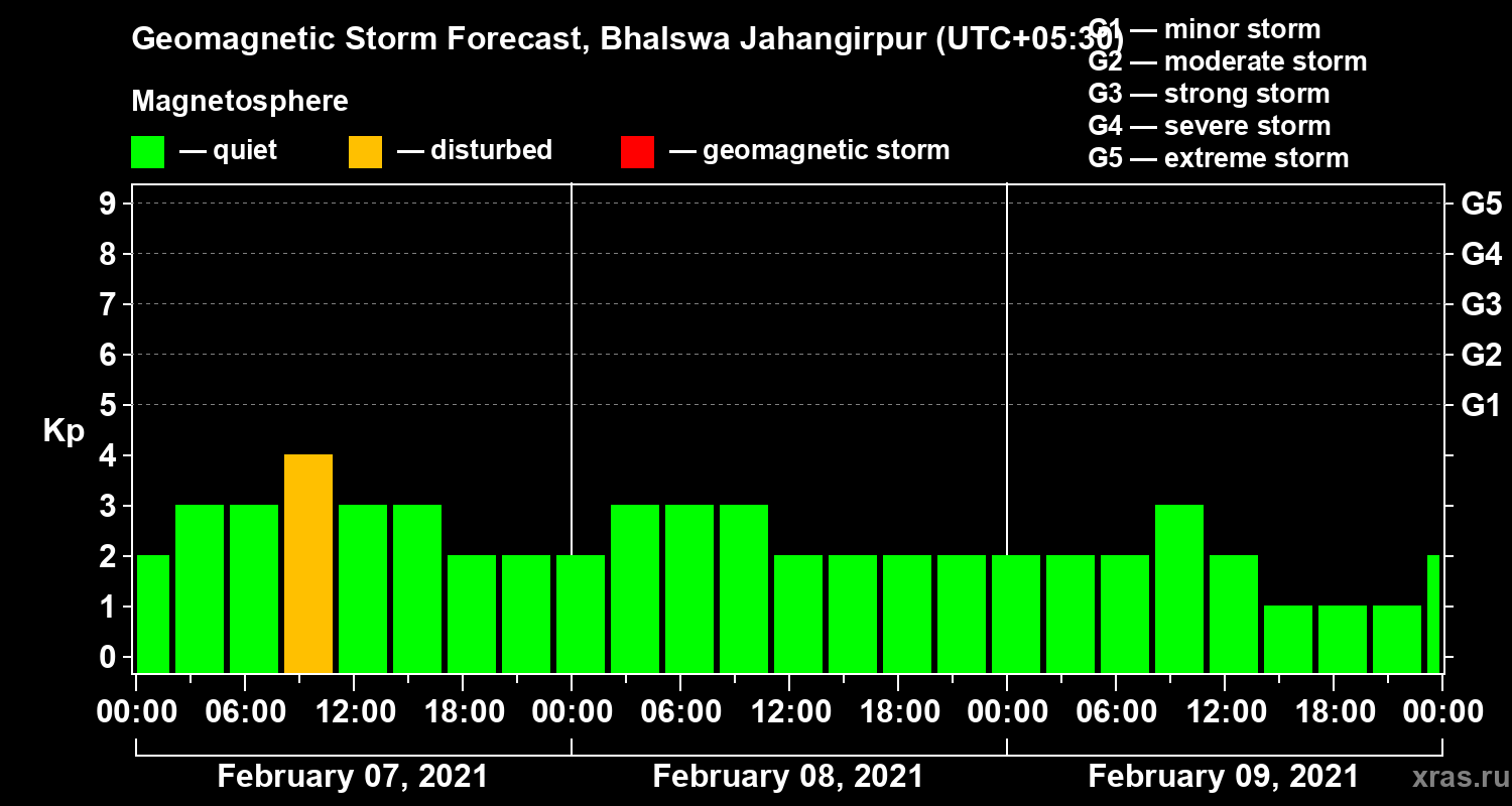 Geomagnetic storm forecast in Bhalswa Jahangirpur for Feb 07, 2021