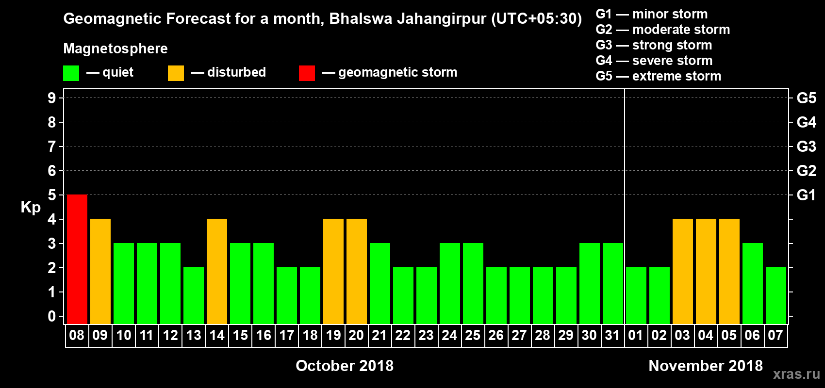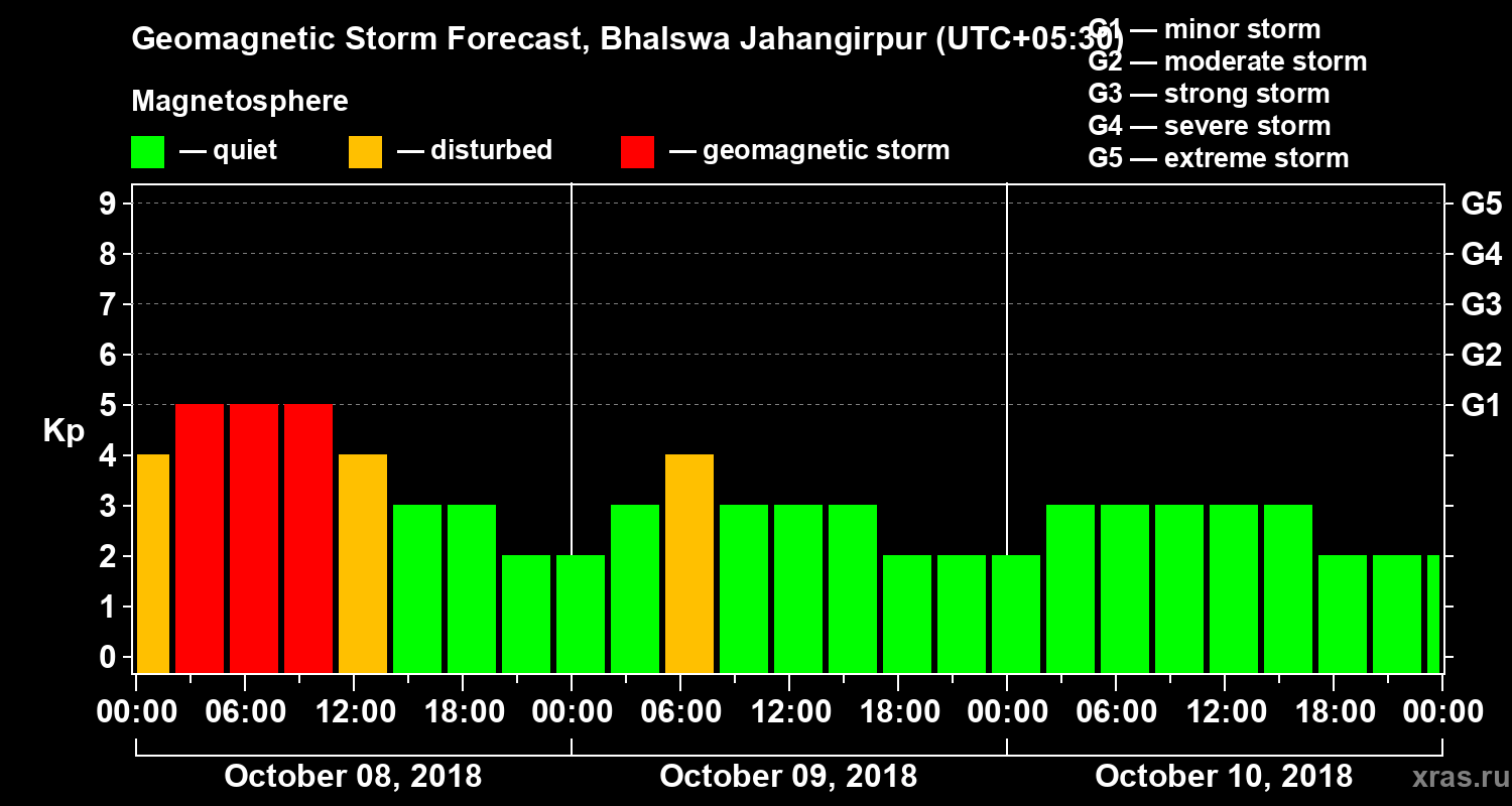 Geomagnetic storm forecast in Bhalswa Jahangirpur for Oct 08, 2018