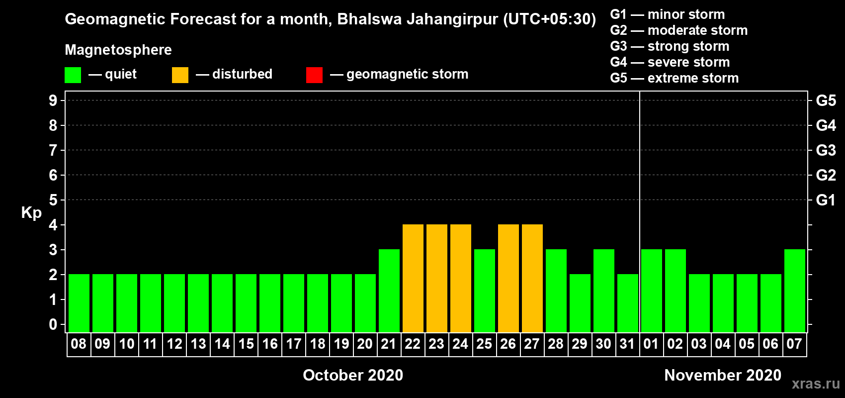 Geomagnetic storm forecast in Bhalswa Jahangirpur for Oct 08, 2020