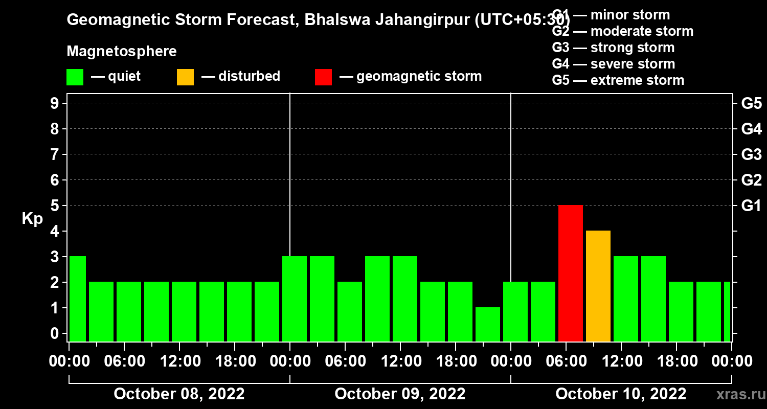 Geomagnetic storm forecast in Bhalswa Jahangirpur for Oct 08, 2022