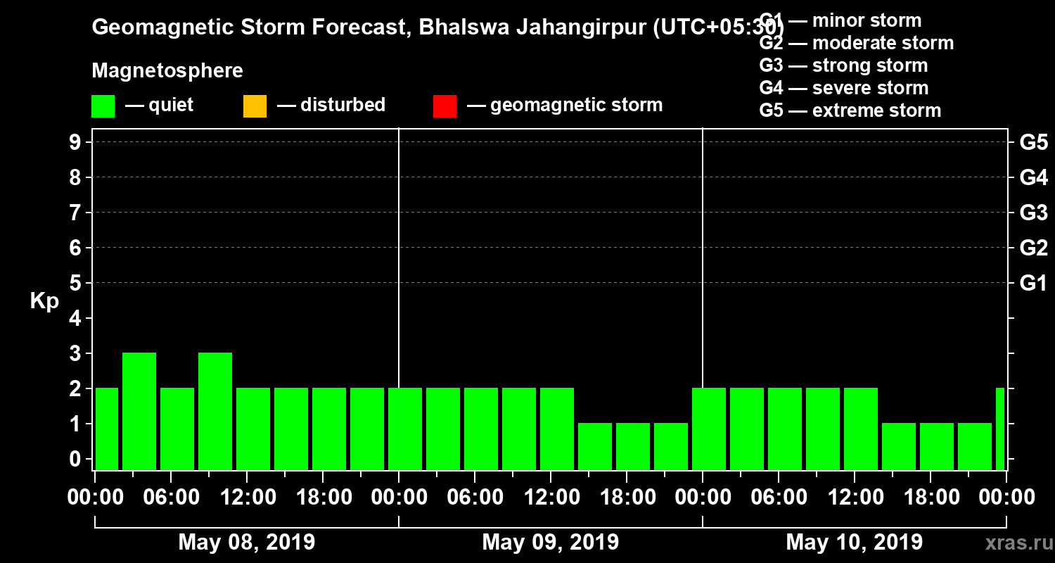 Geomagnetic activity forecast in Bhalswa Jahangirpur — May 08, 2019
