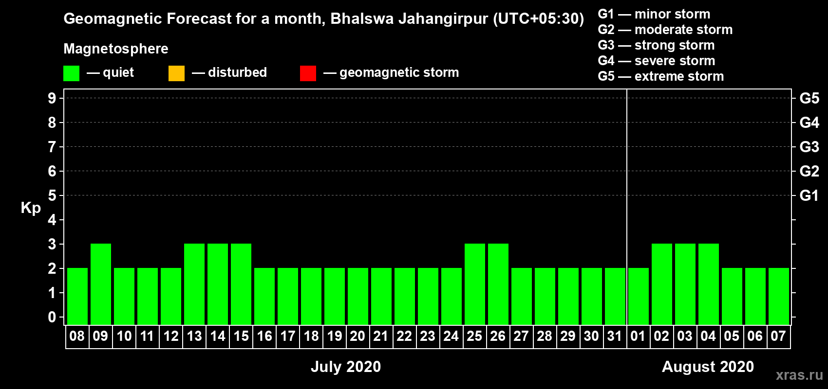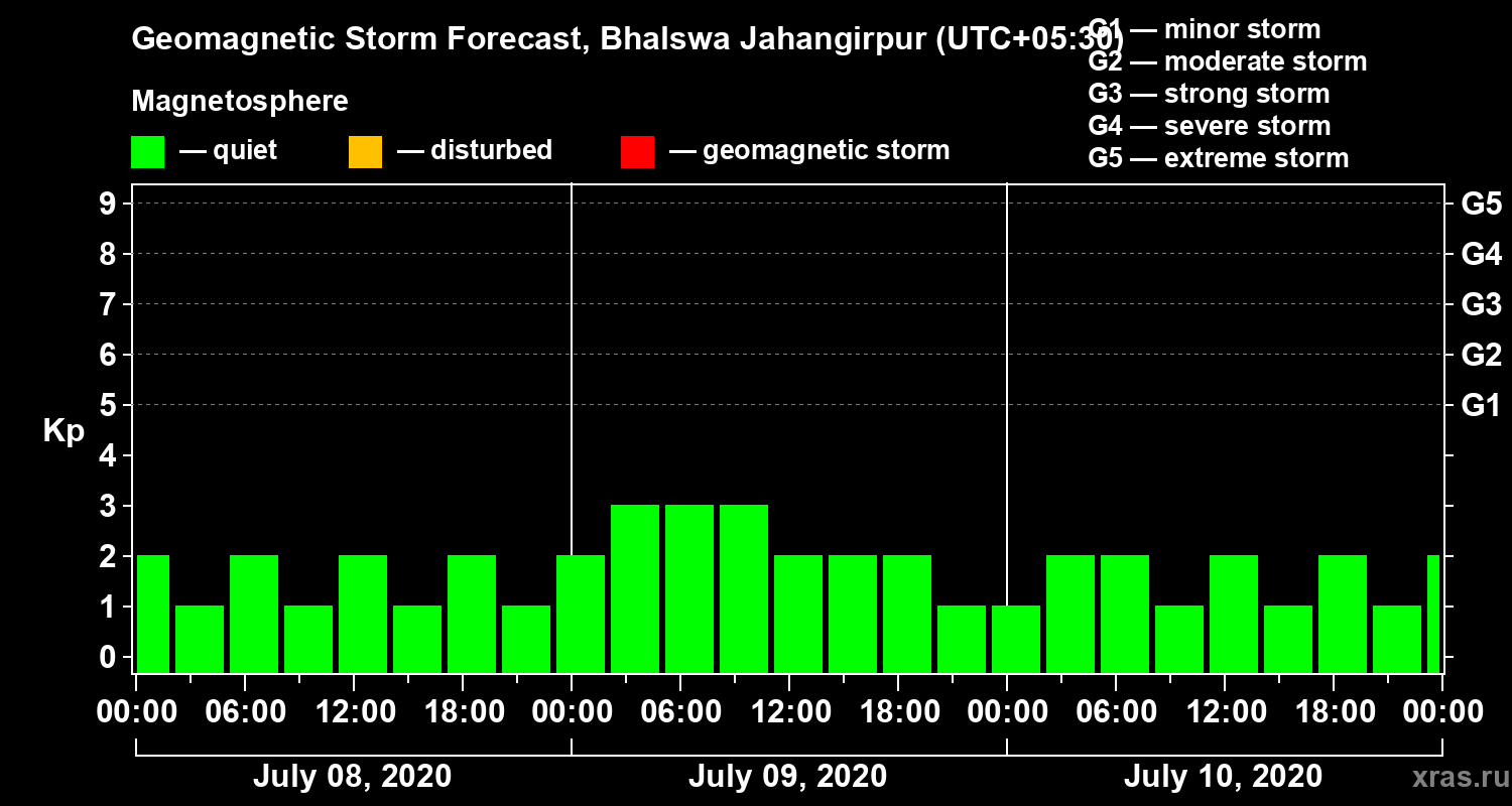 Geomagnetic storm forecast in Bhalswa Jahangirpur for Jul 08, 2020