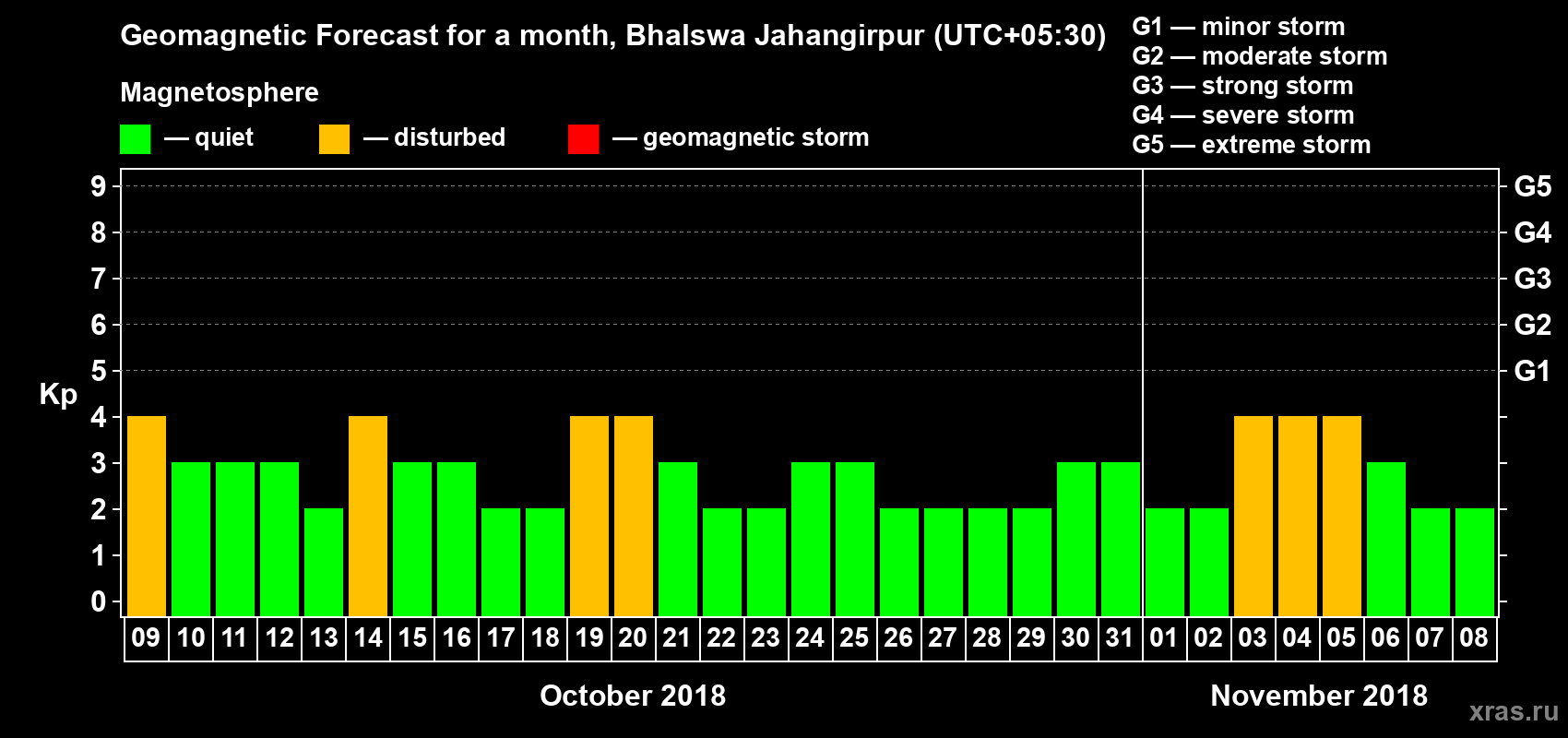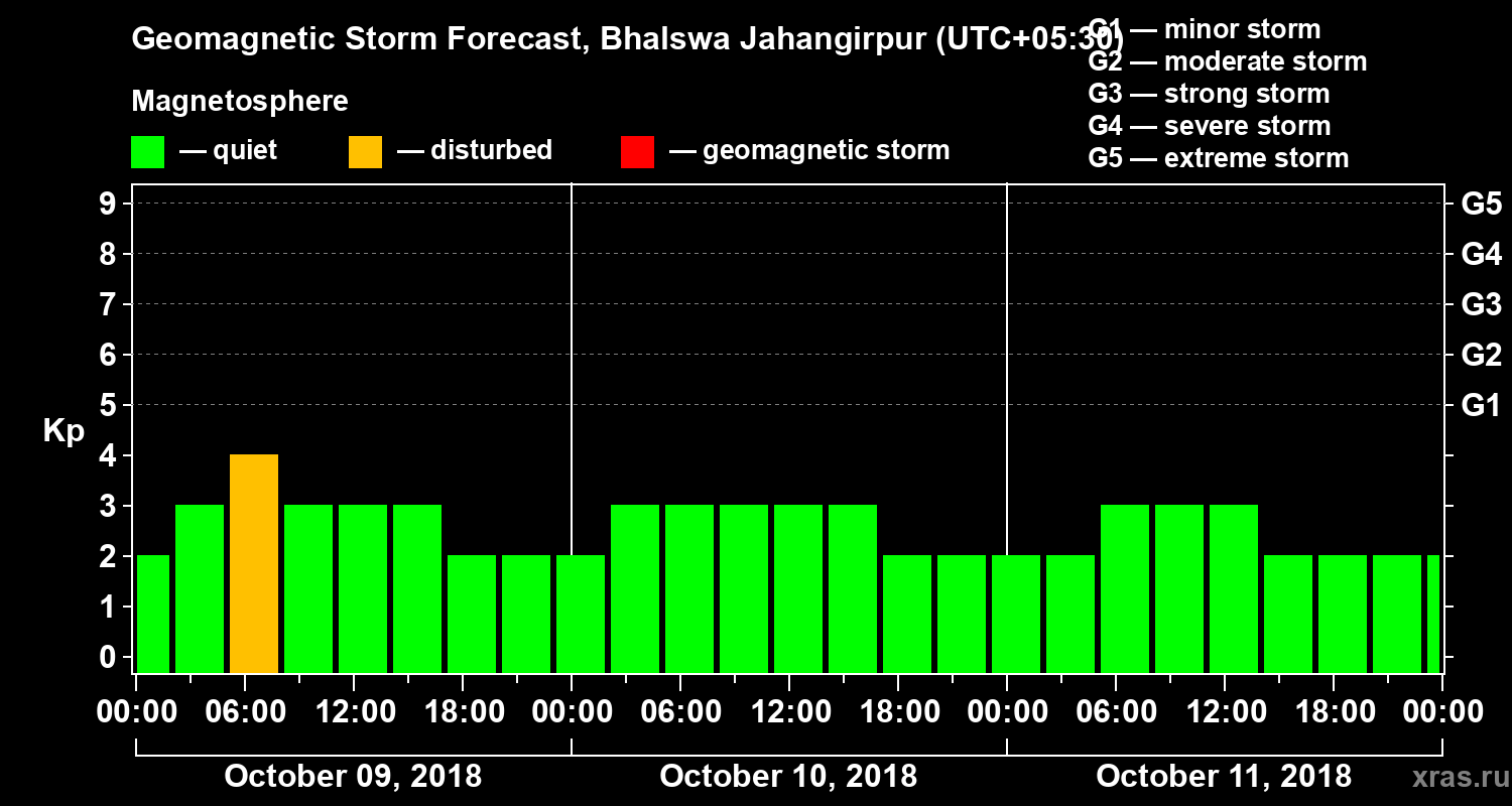 Geomagnetic storm forecast in Bhalswa Jahangirpur for Oct 09, 2018