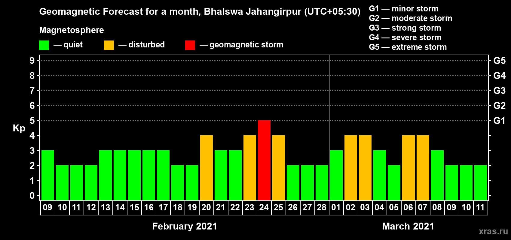 Geomagnetic storm forecast in Bhalswa Jahangirpur for Feb 09, 2021