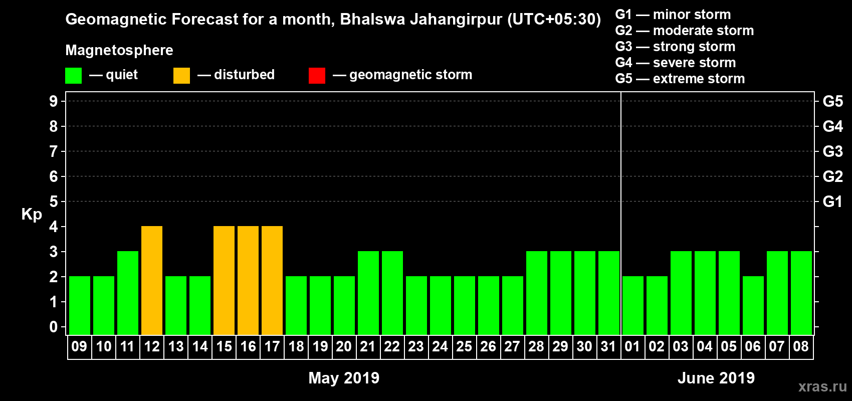 Geomagnetic activity forecast in Bhalswa Jahangirpur — May 09, 2019