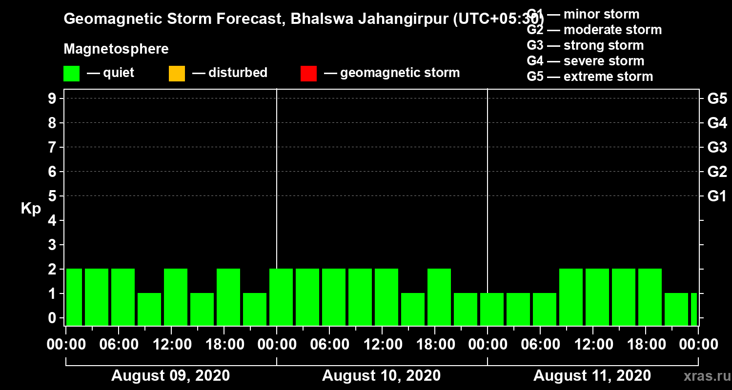 Geomagnetic storm forecast in Bhalswa Jahangirpur for Aug 09, 2020