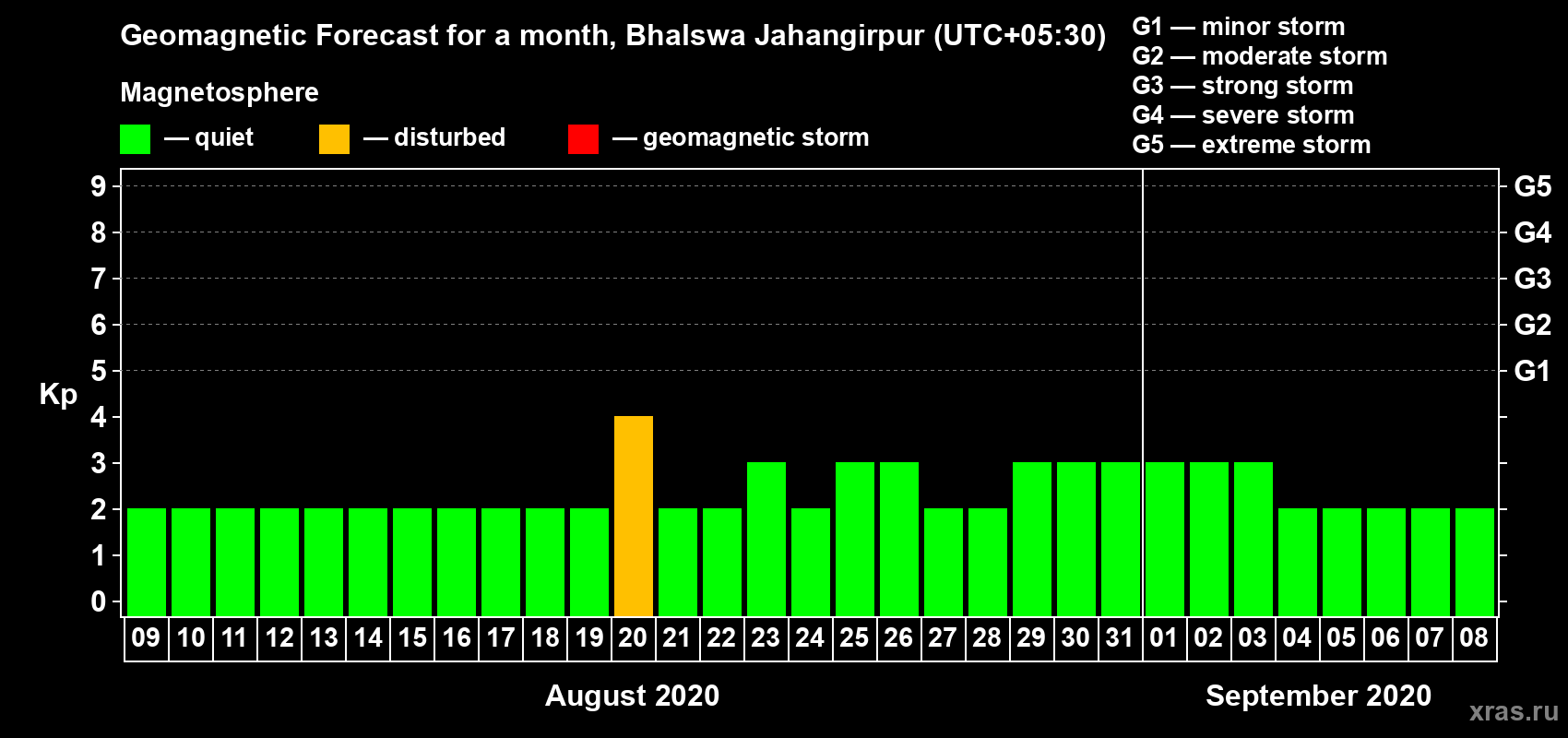 Geomagnetic activity forecast in Bhalswa Jahangirpur — Aug 09, 2020