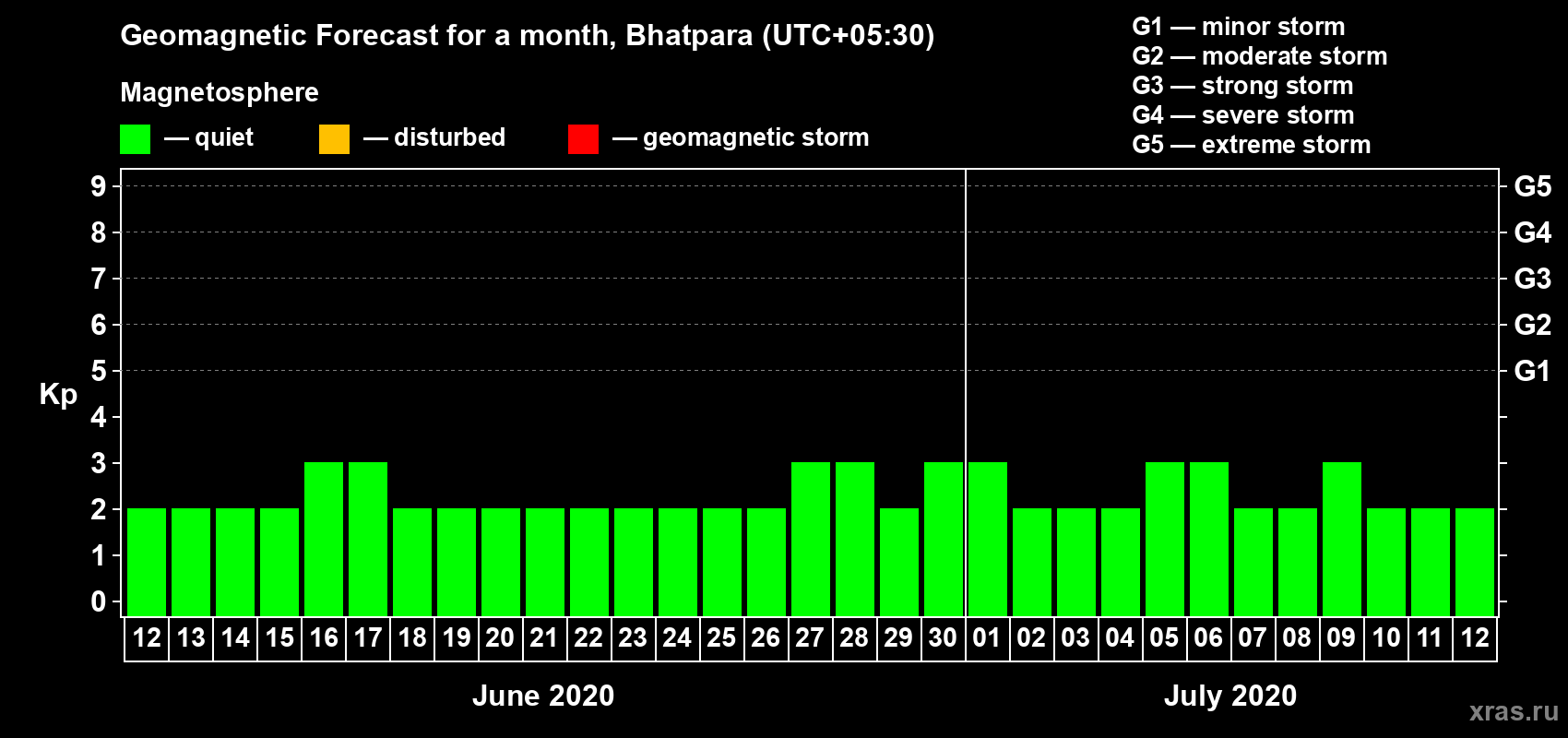Geomagnetic storm forecast in Bhatpara for Jun 12, 2020