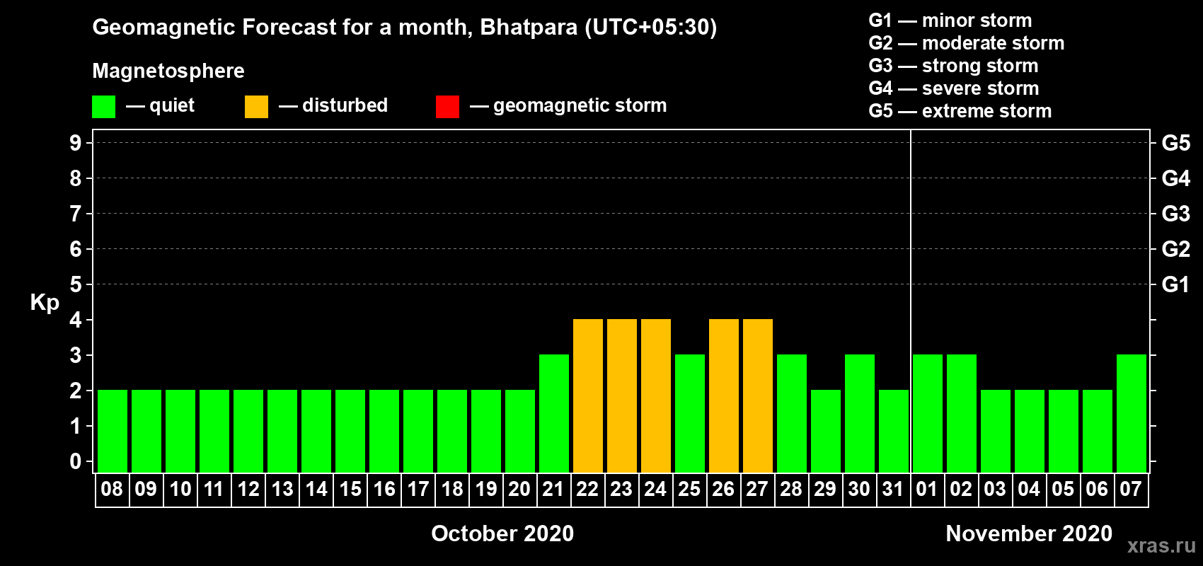 Geomagnetic storm forecast in Bhatpara for Oct 08, 2020