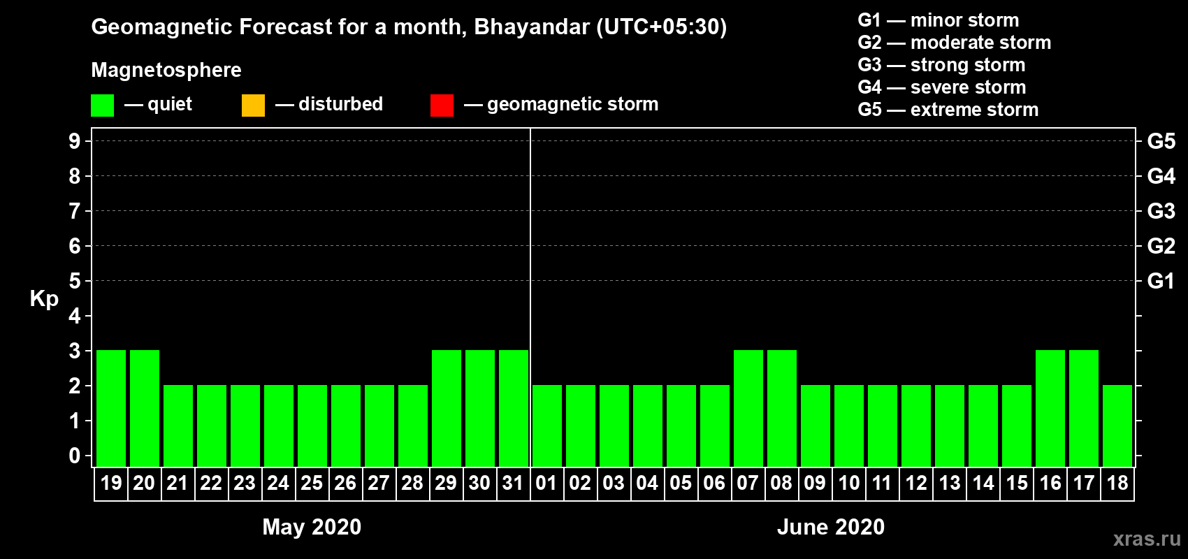Geomagnetic storm forecast in Bhayandar for May 19, 2020