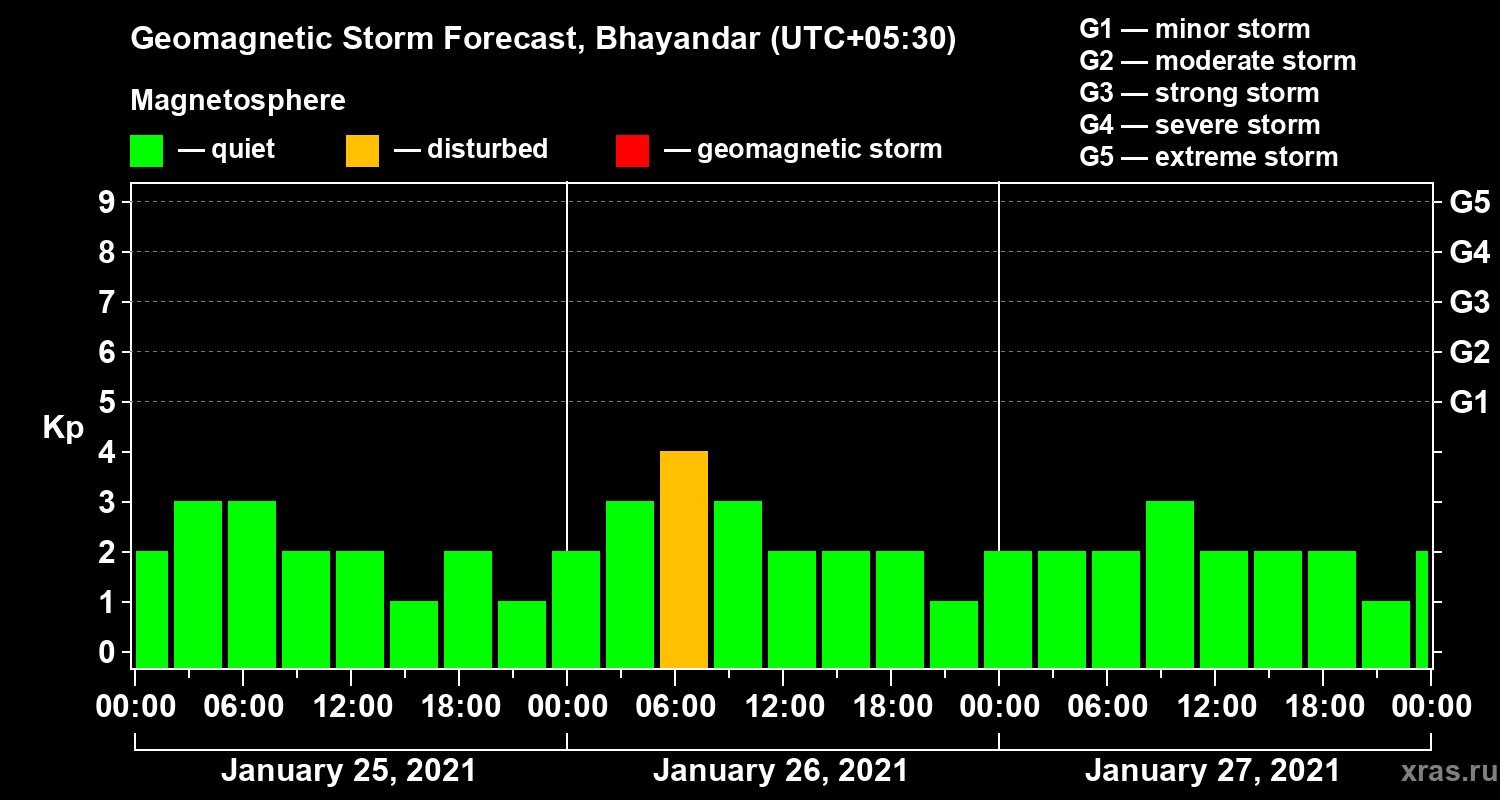 Geomagnetic storm forecast in Bhayandar for Jan 25, 2021