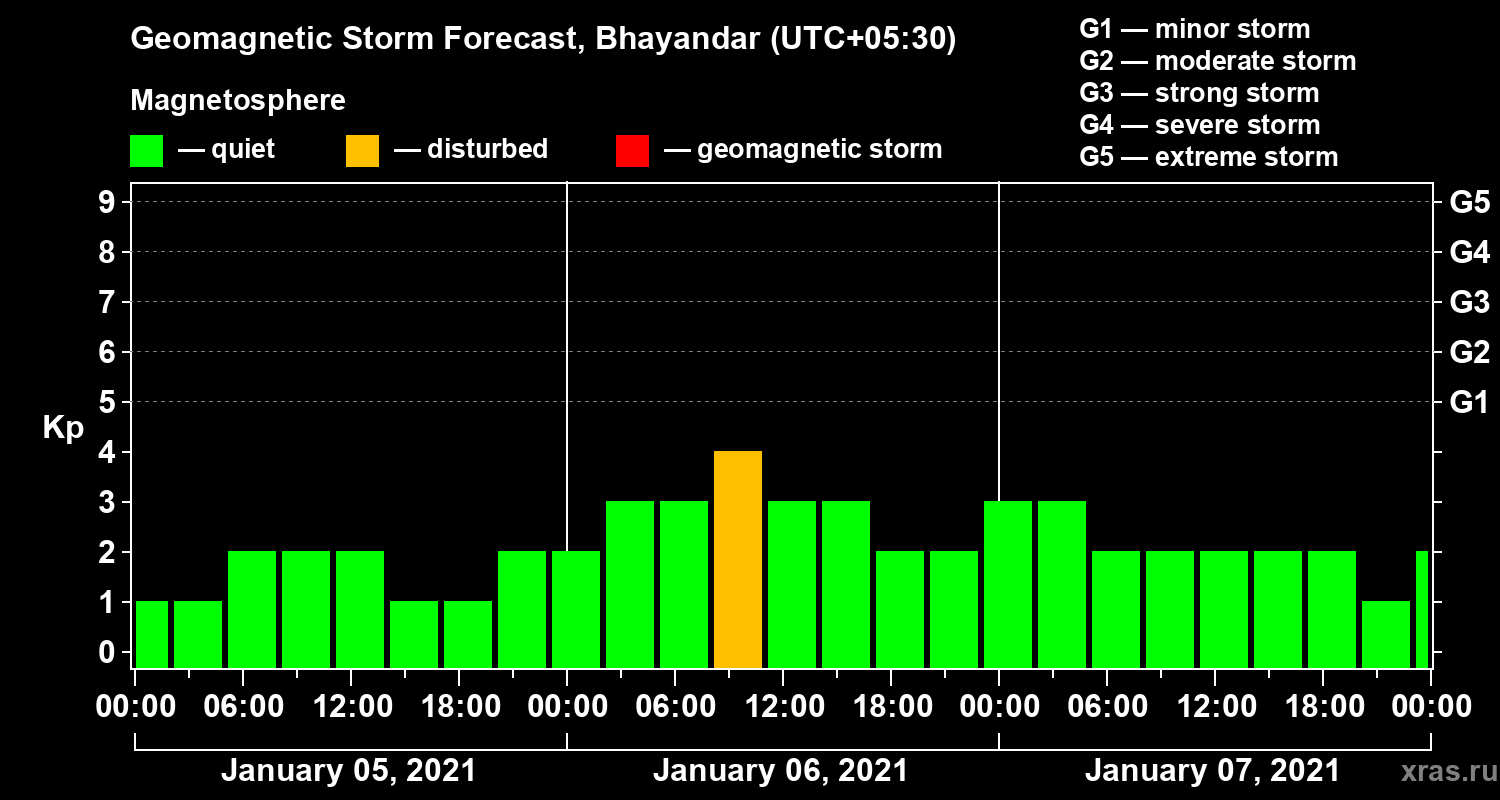 Geomagnetic storm forecast in Bhayandar for Jan 05, 2021
