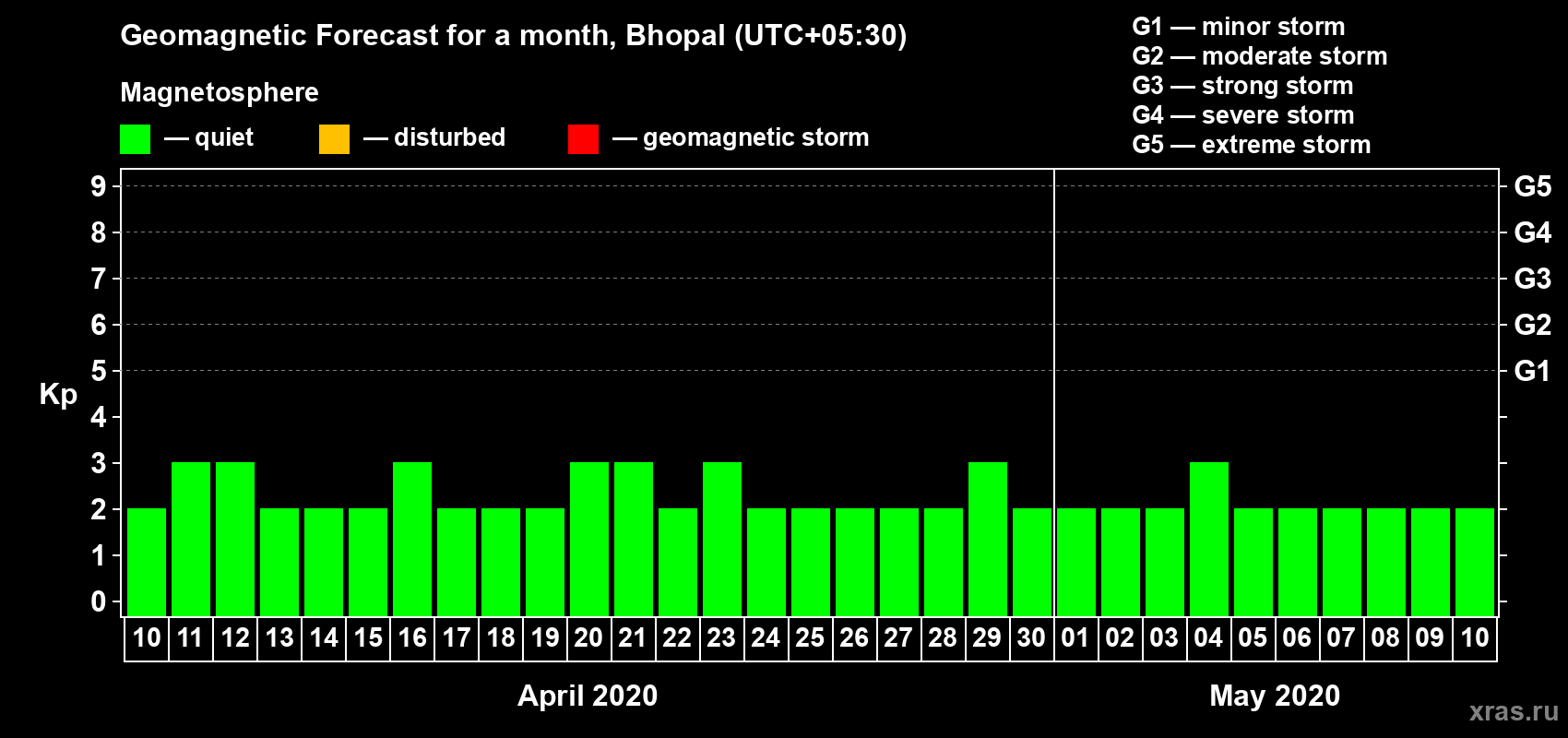 Geomagnetic storm forecast in Bhopal for Apr 10, 2020