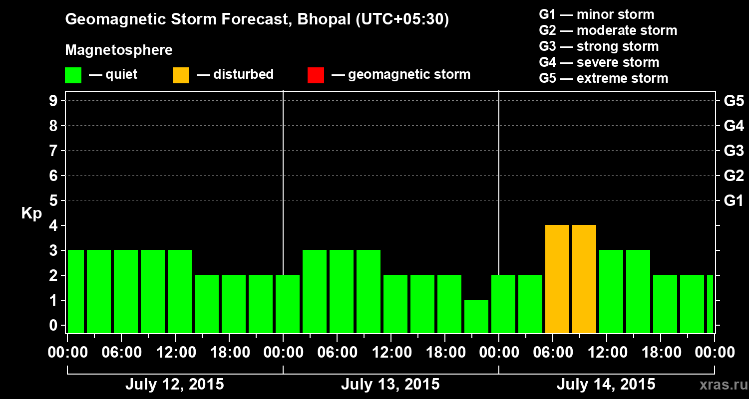 Geomagnetic storm forecast in Bhopal for Jul 12, 2015