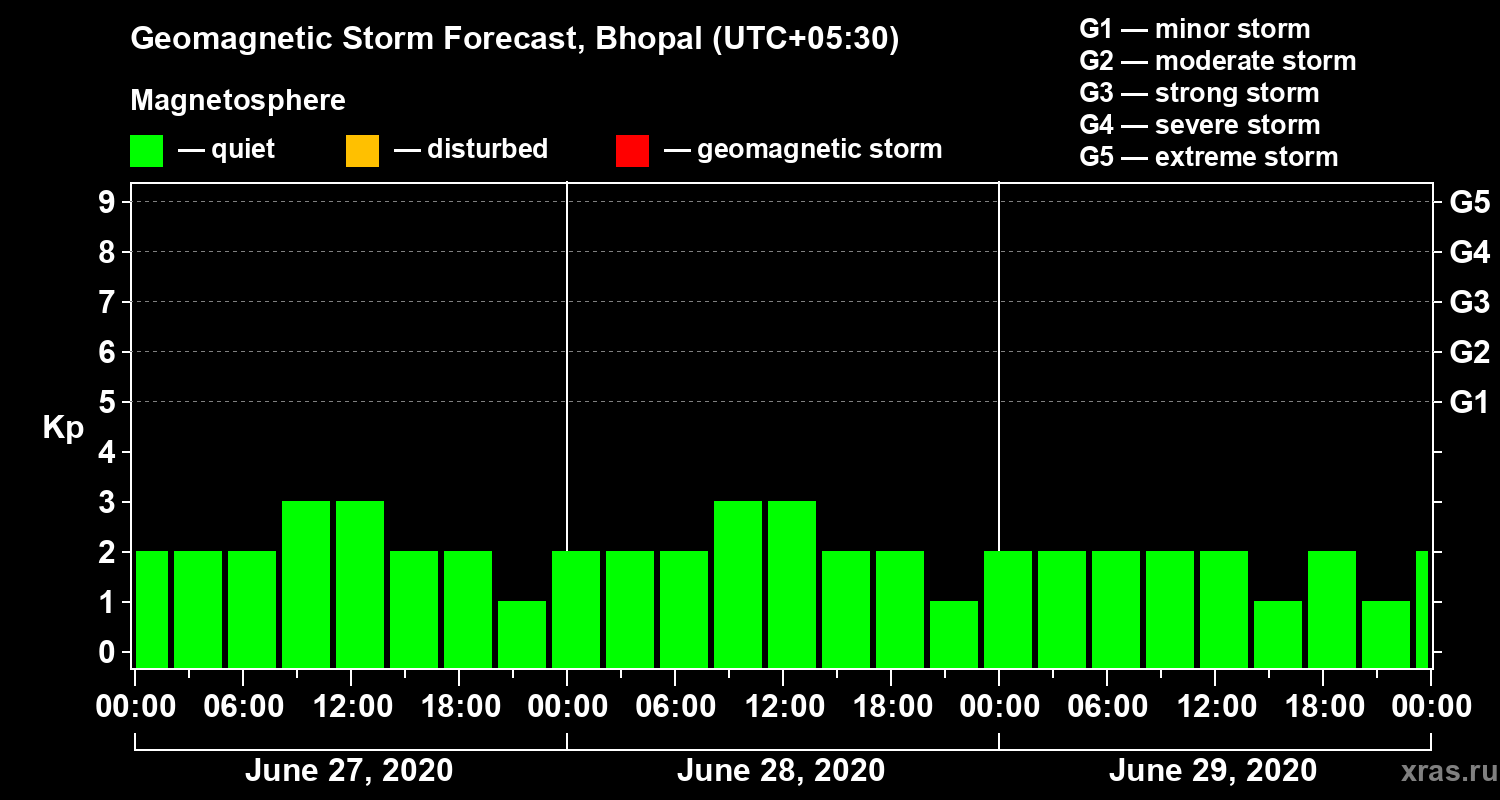 Geomagnetic storm forecast in Bhopal for Jun 27, 2020