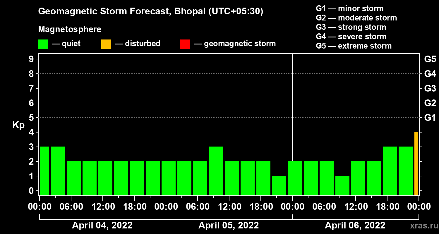 Geomagnetic storm forecast in Bhopal for Apr 04, 2022