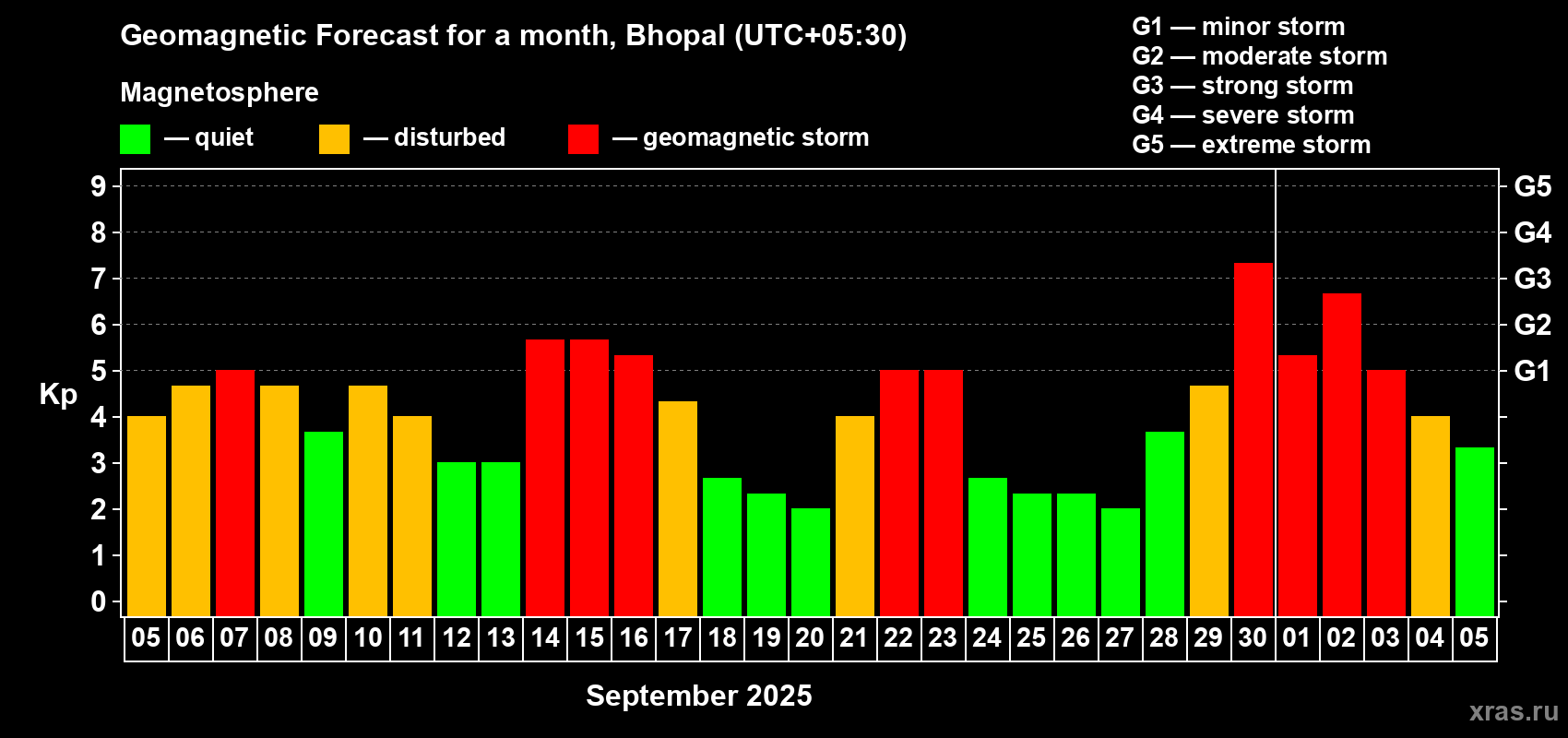 Geomagnetic storm forecast in Bhopal for Sep 05, 2025