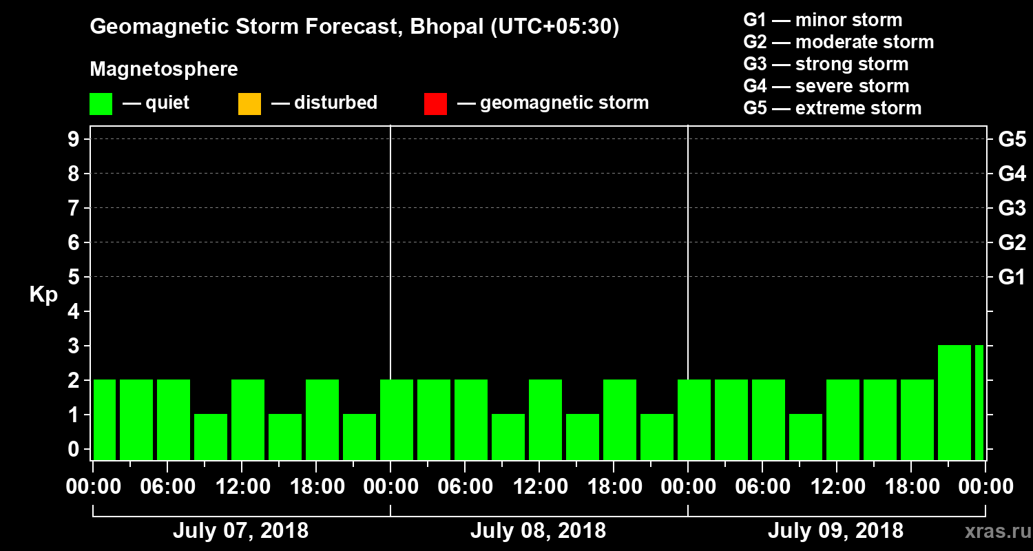 Geomagnetic storm forecast in Bhopal for Jul 07, 2018