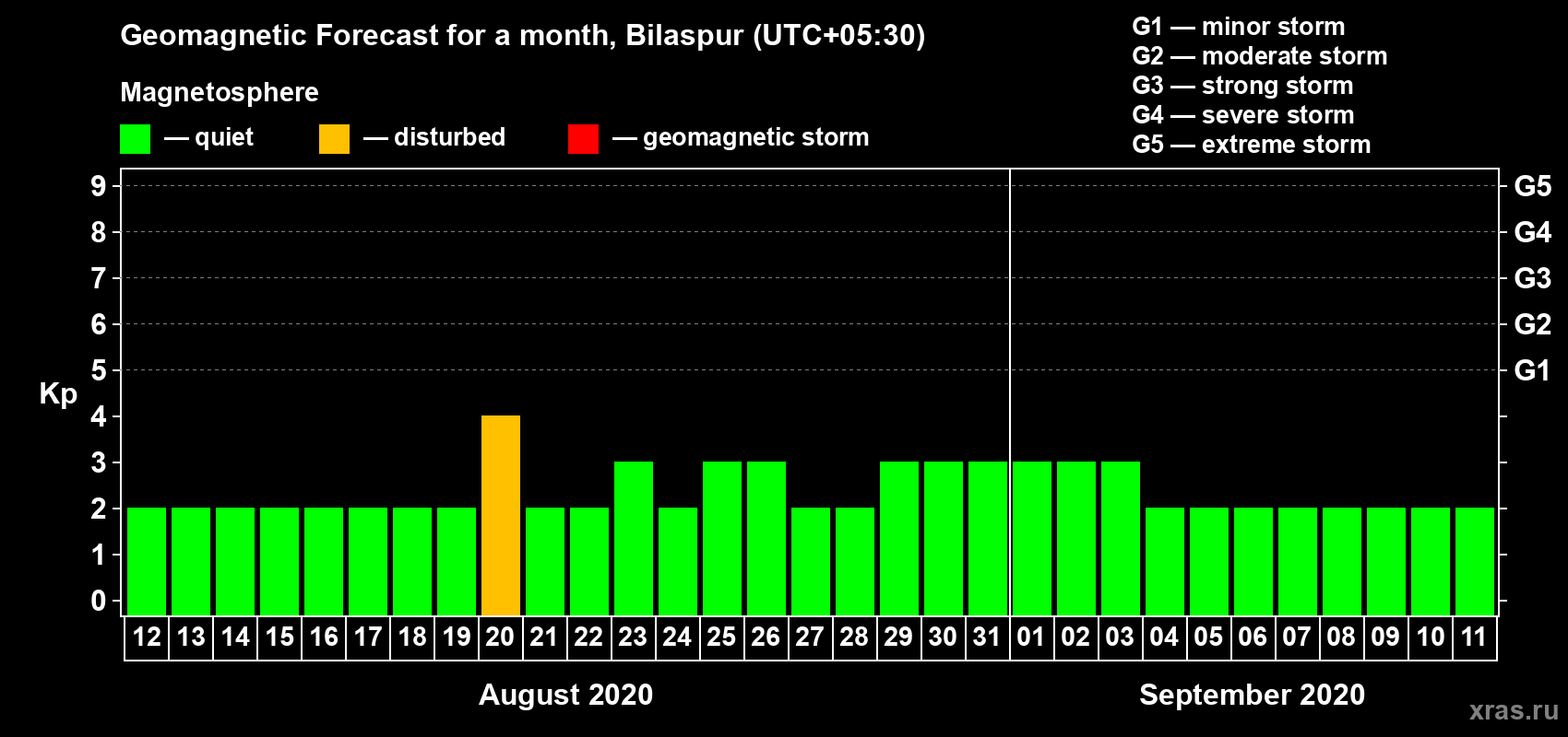 Geomagnetic storm forecast in Bilaspur for Aug 12, 2020