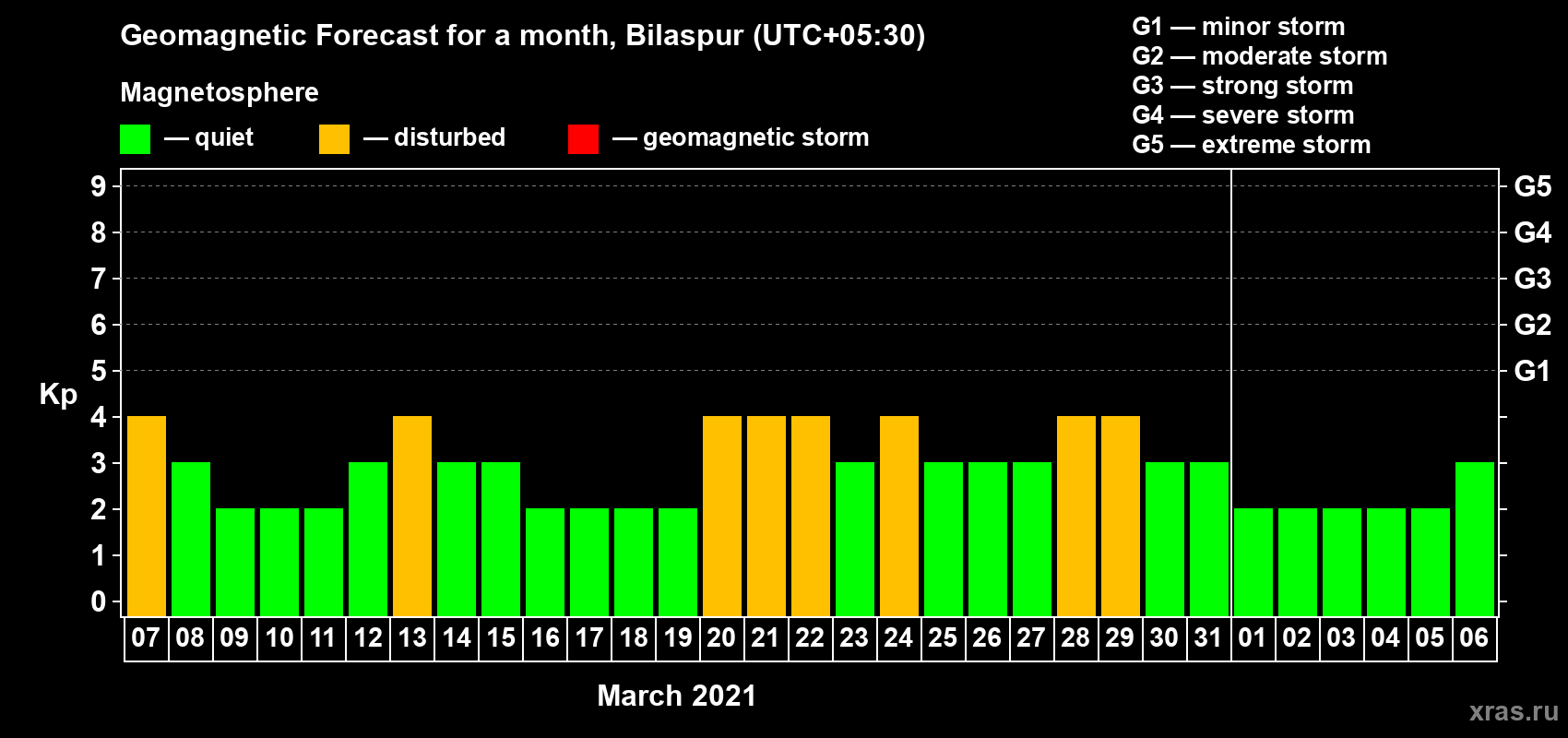 Geomagnetic storm forecast in Bilaspur for Mar 07, 2021
