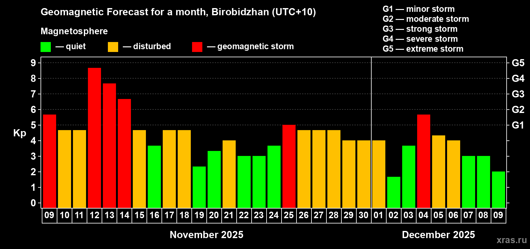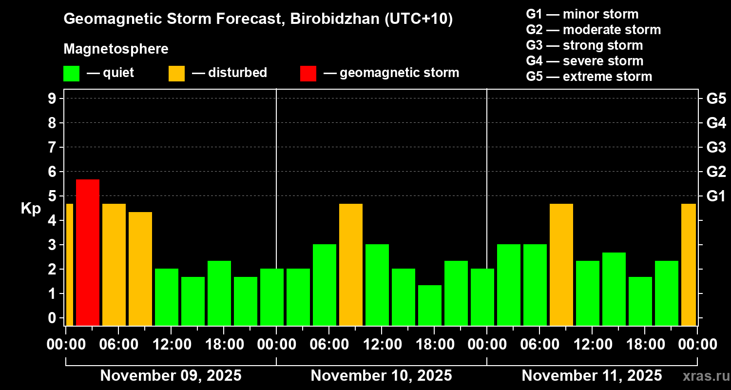 Geomagnetic storm forecast in Birobidzhan for Nov 09, 2025