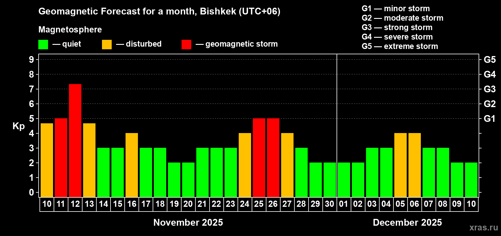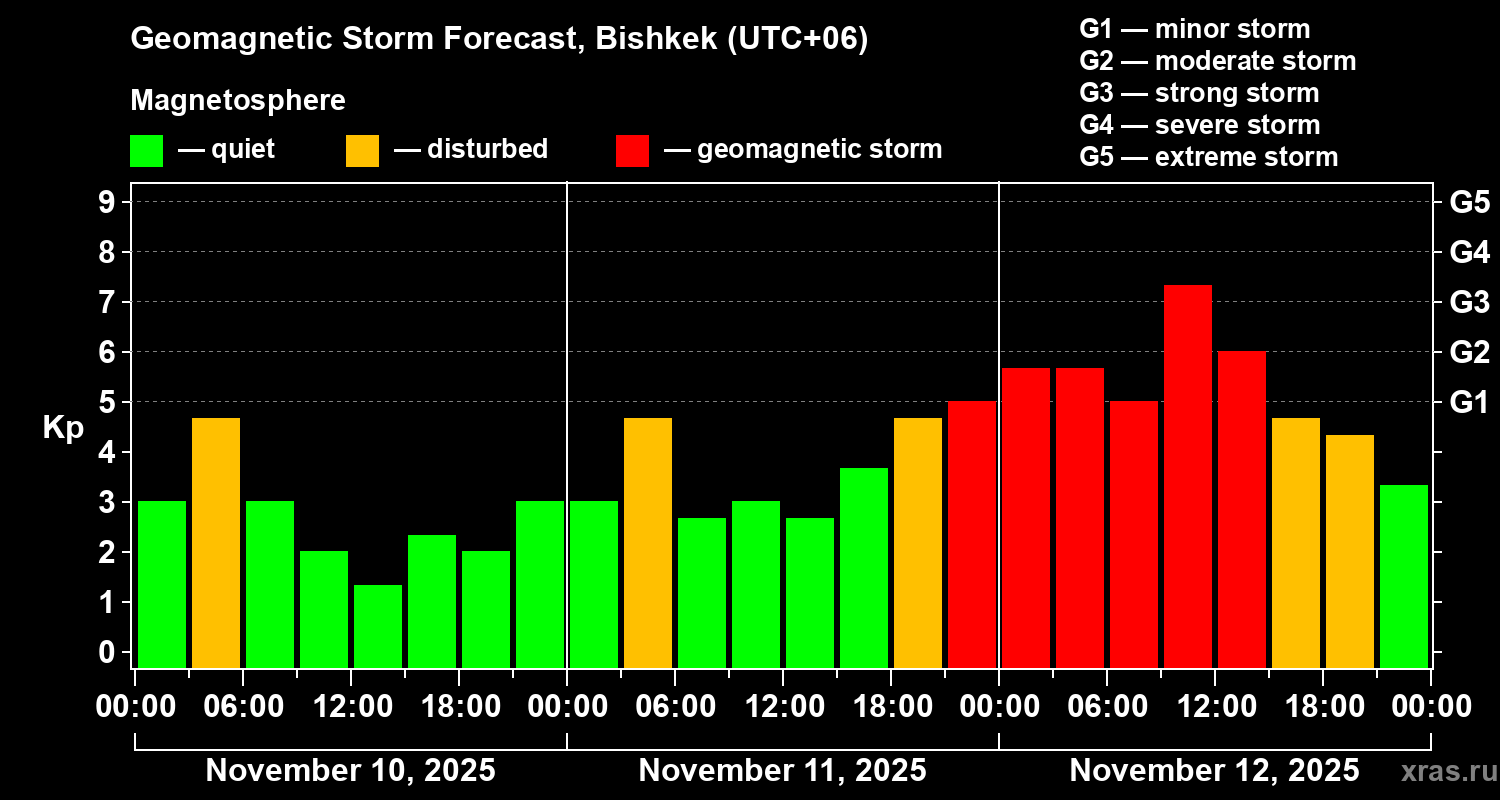 Geomagnetic storm forecast in Bishkek for Nov 10, 2025