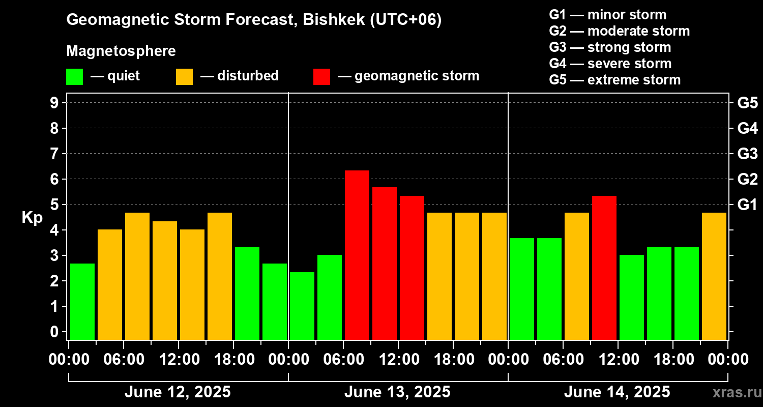 Geomagnetic storm forecast in Bishkek for Jun 12, 2025
