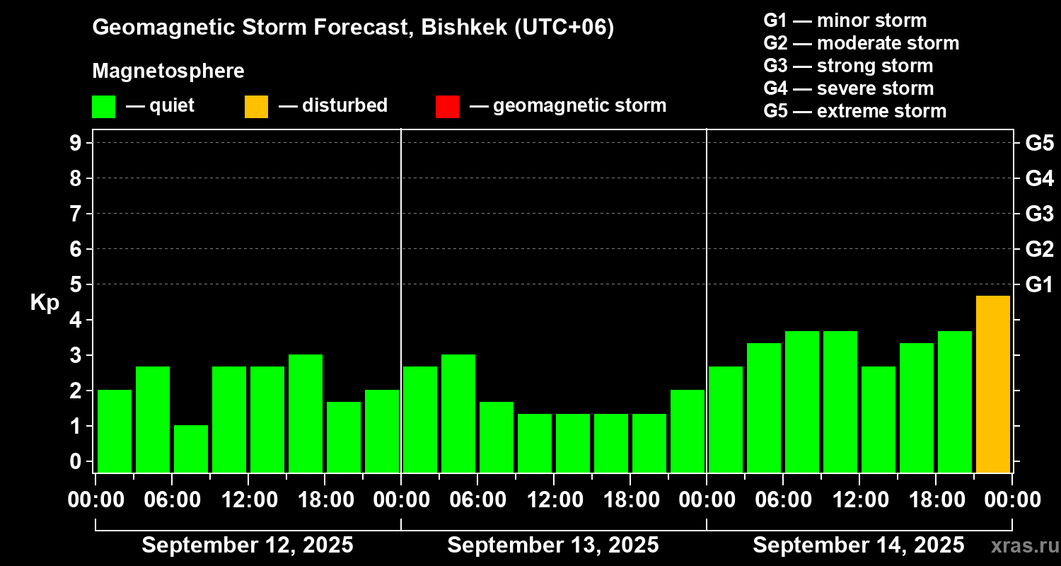 Geomagnetic activity forecast in Bishkek — Sep 12, 2025