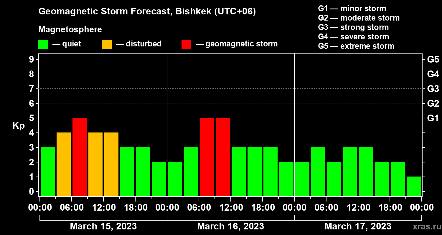 Geomagnetic storm forecast in Bishkek for Mar 15, 2023