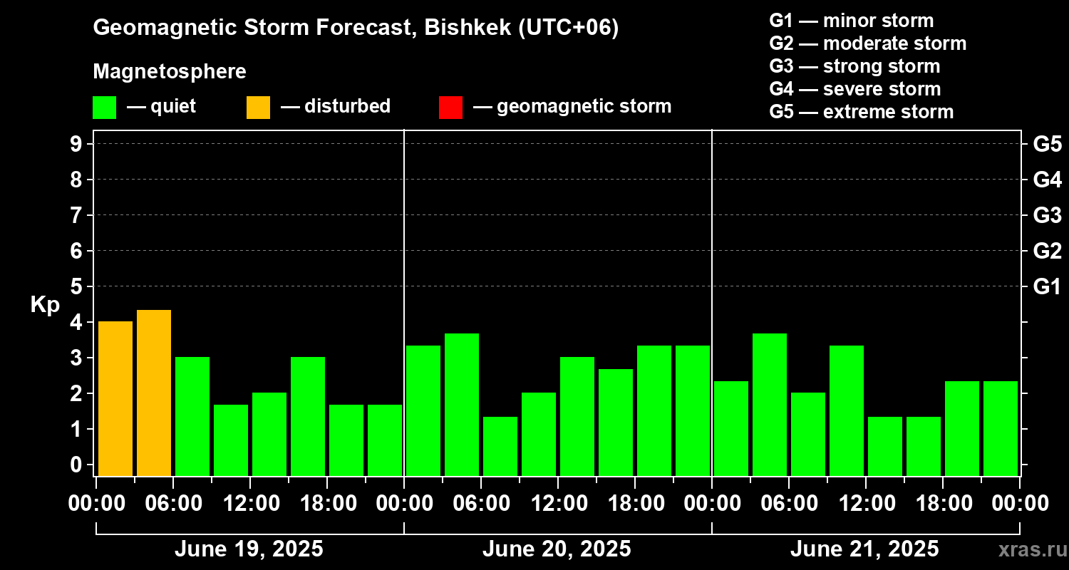 Geomagnetic storm forecast in Bishkek for Jun 19, 2025
