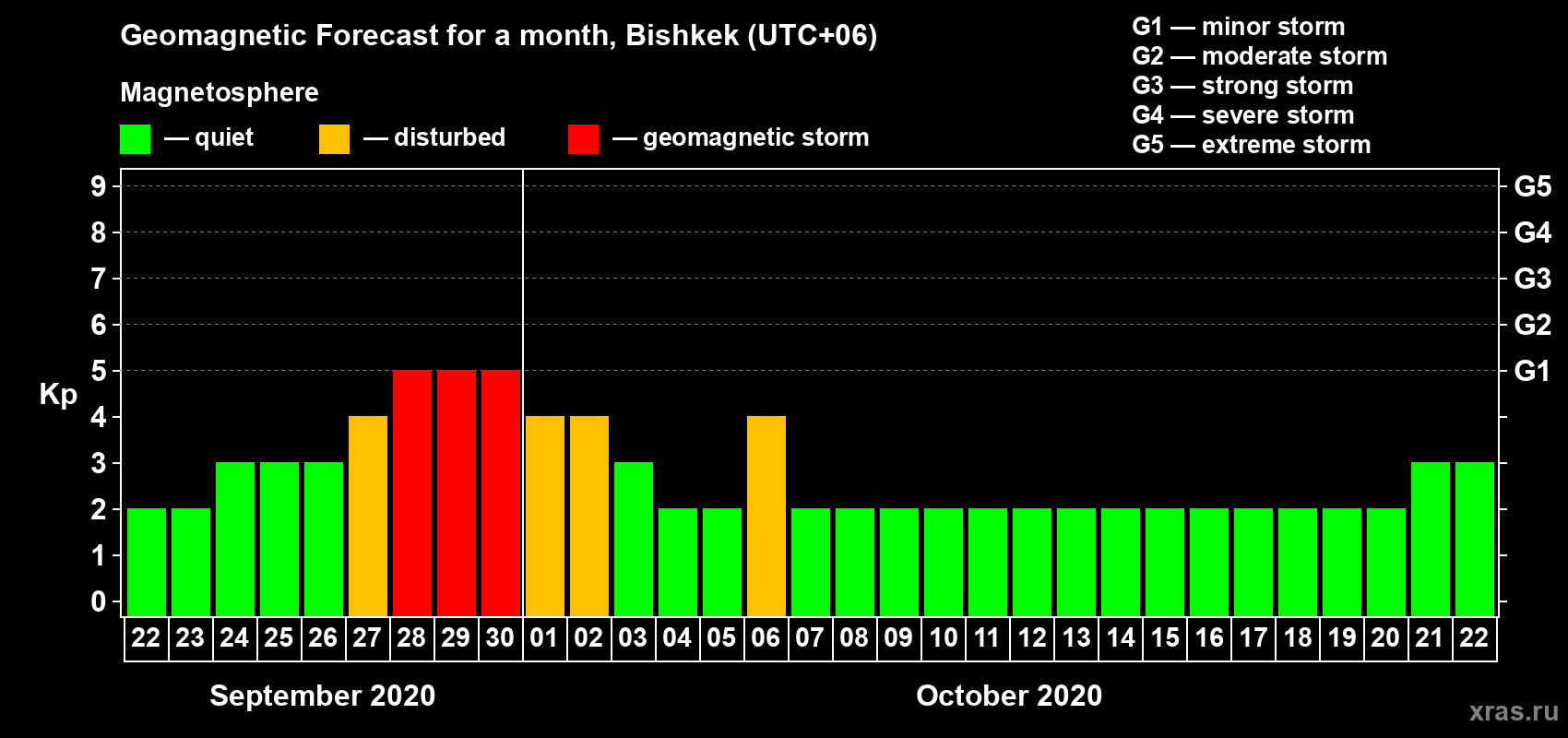 Geomagnetic storm forecast in Bishkek for Sep 22, 2020