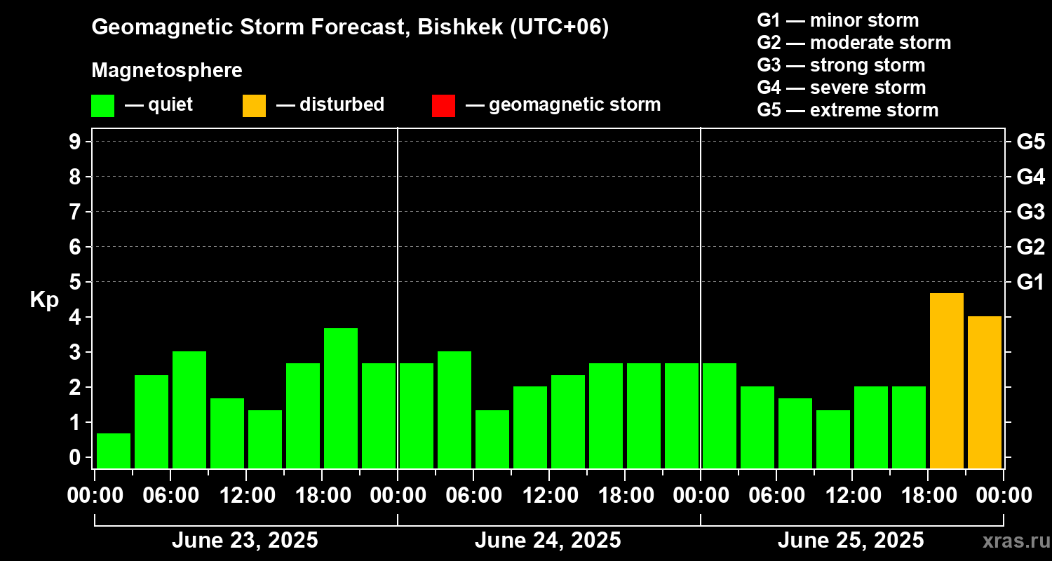 Geomagnetic storm forecast in Bishkek for Jun 23, 2025