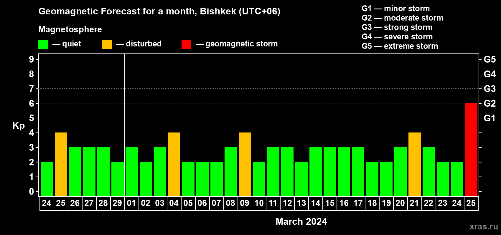 Geomagnetic storm forecast in Bishkek for Feb 24, 2024