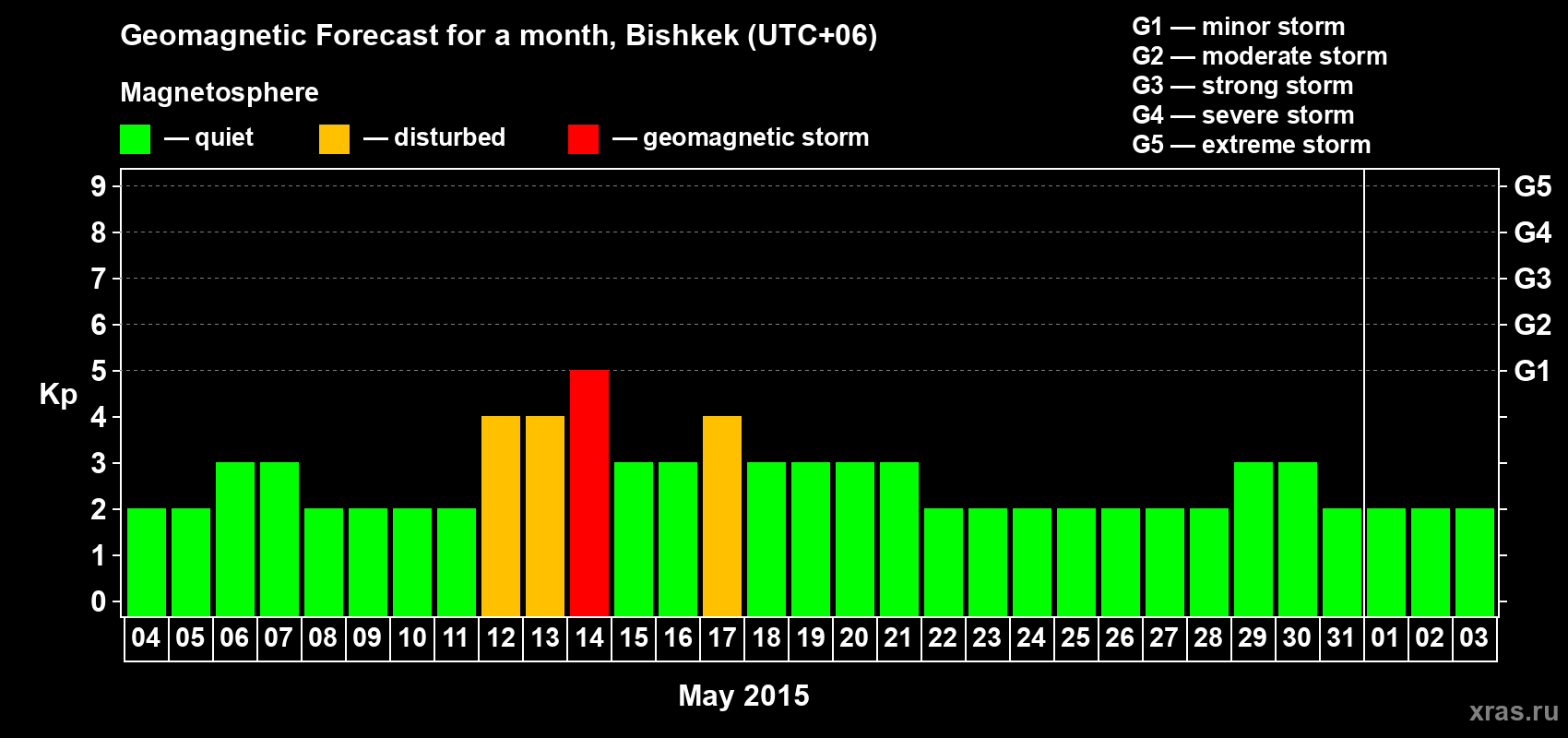 Geomagnetic activity forecast in Bishkek — May 04, 2015