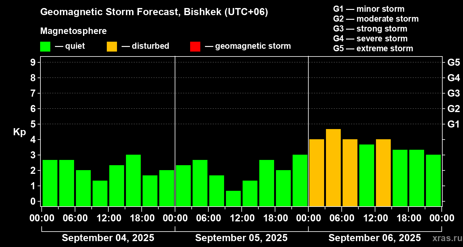 Geomagnetic storm forecast in Bishkek for Sep 04, 2025