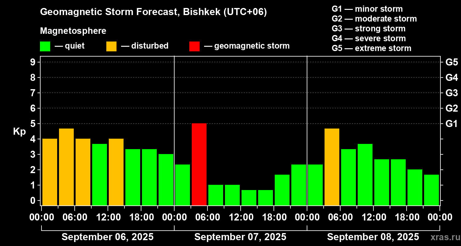 Geomagnetic storm forecast in Bishkek for Sep 06, 2025