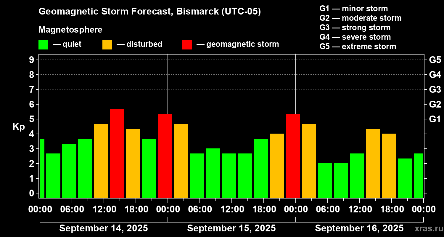 Geomagnetic storm forecast in Bismarck for Sep 14, 2025