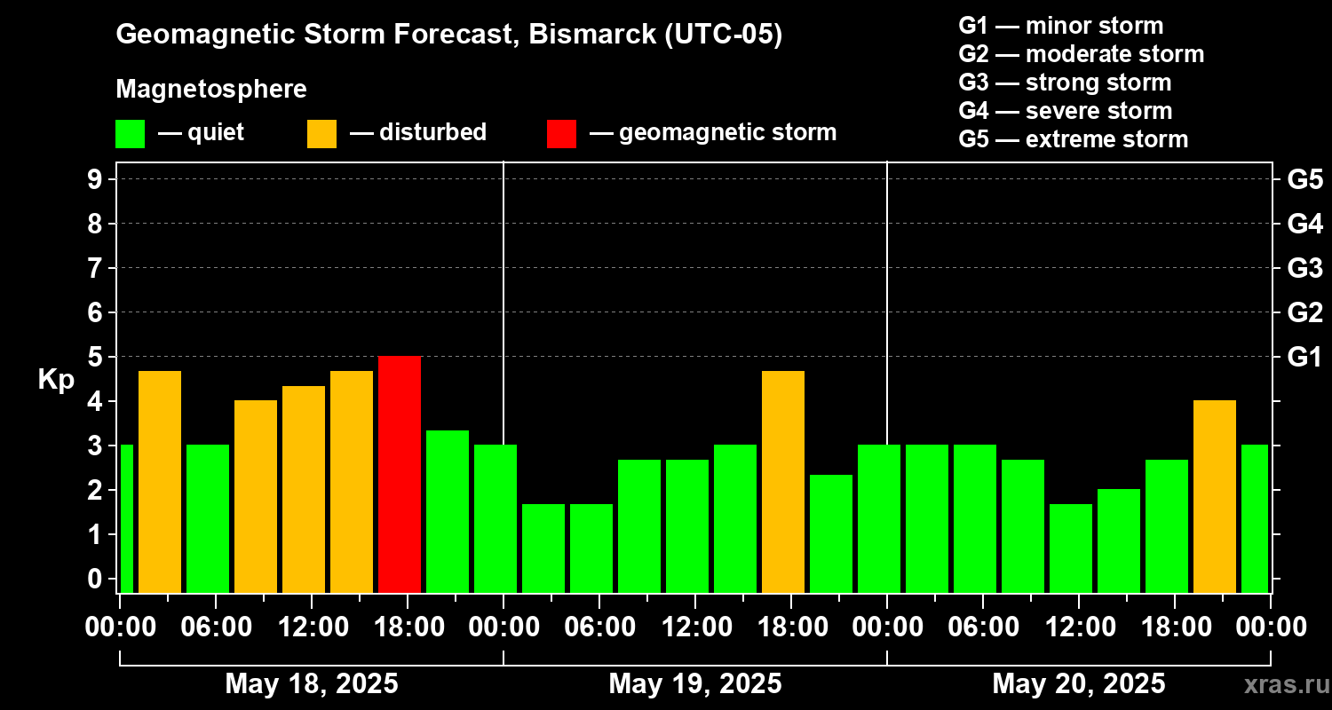 Geomagnetic storm forecast in Bismarck for May 18, 2025