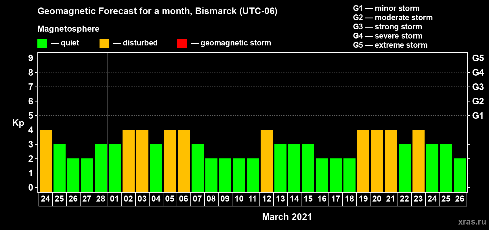 Geomagnetic storm forecast in Bismarck for Feb 24, 2021