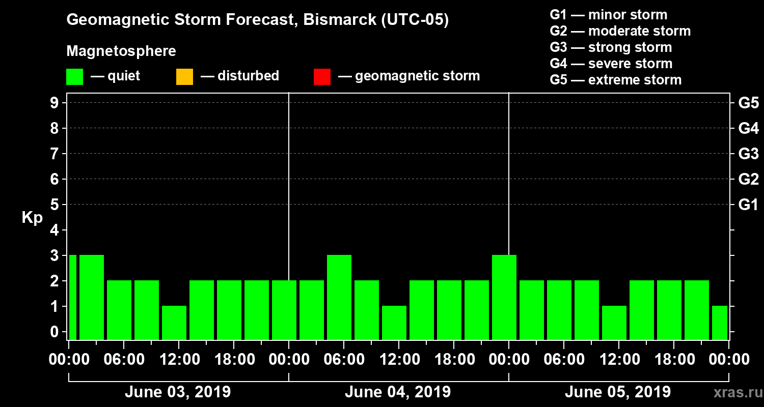 Geomagnetic storm forecast in Bismarck for Jun 03, 2019