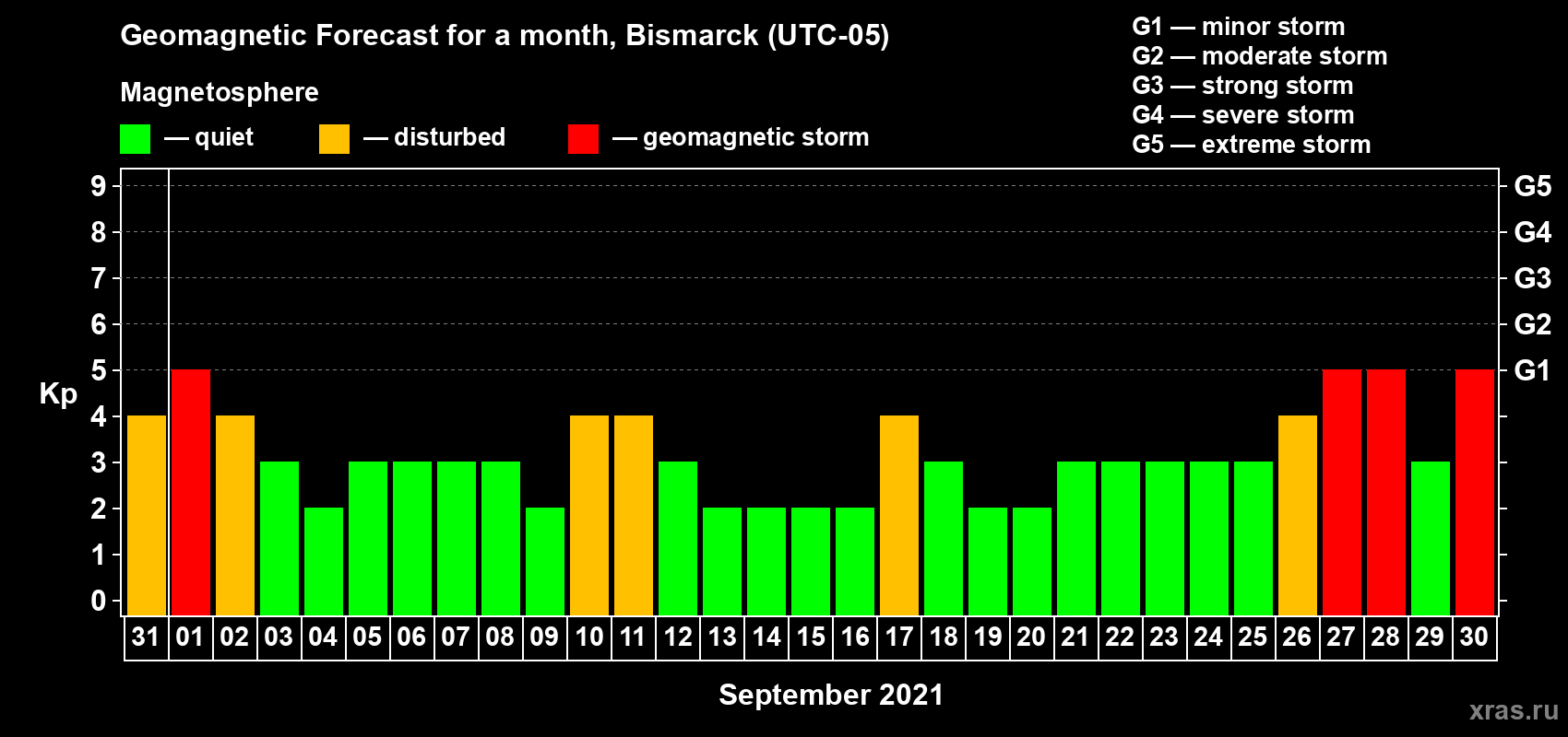 Geomagnetic storm forecast in Bismarck for Aug 31, 2021
